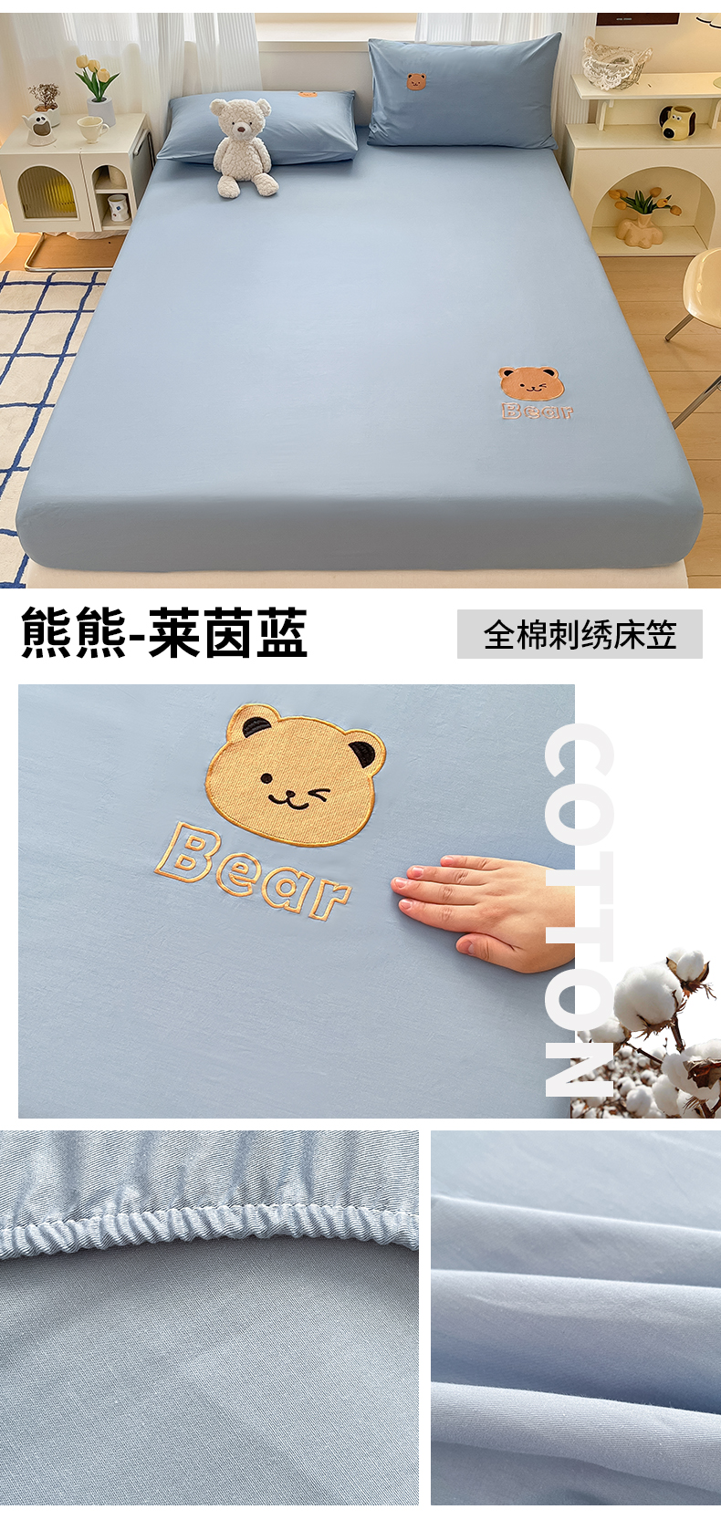 • 91家纺网 家纺一手货源 找家纺 九亭家纺  2024新款熊熊系列全棉刺绣单层床笠 熊熊-莱茵蓝
