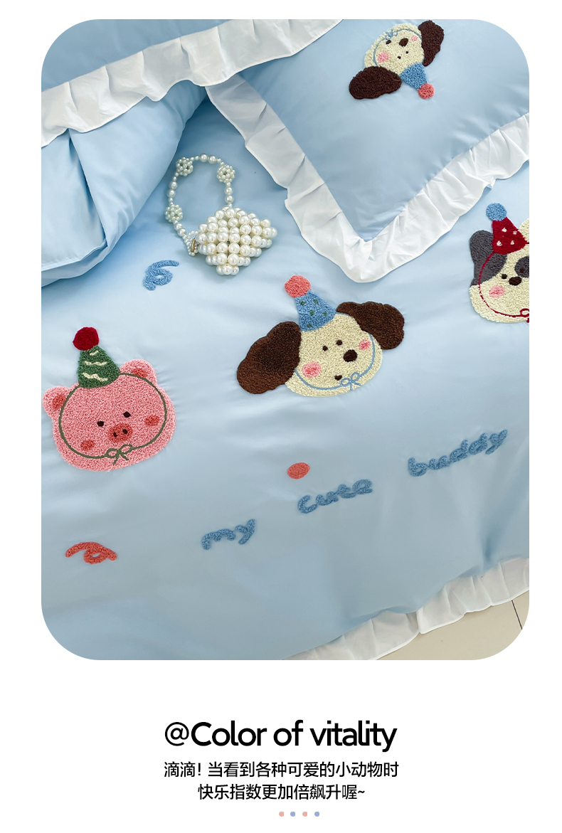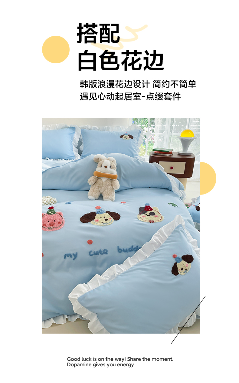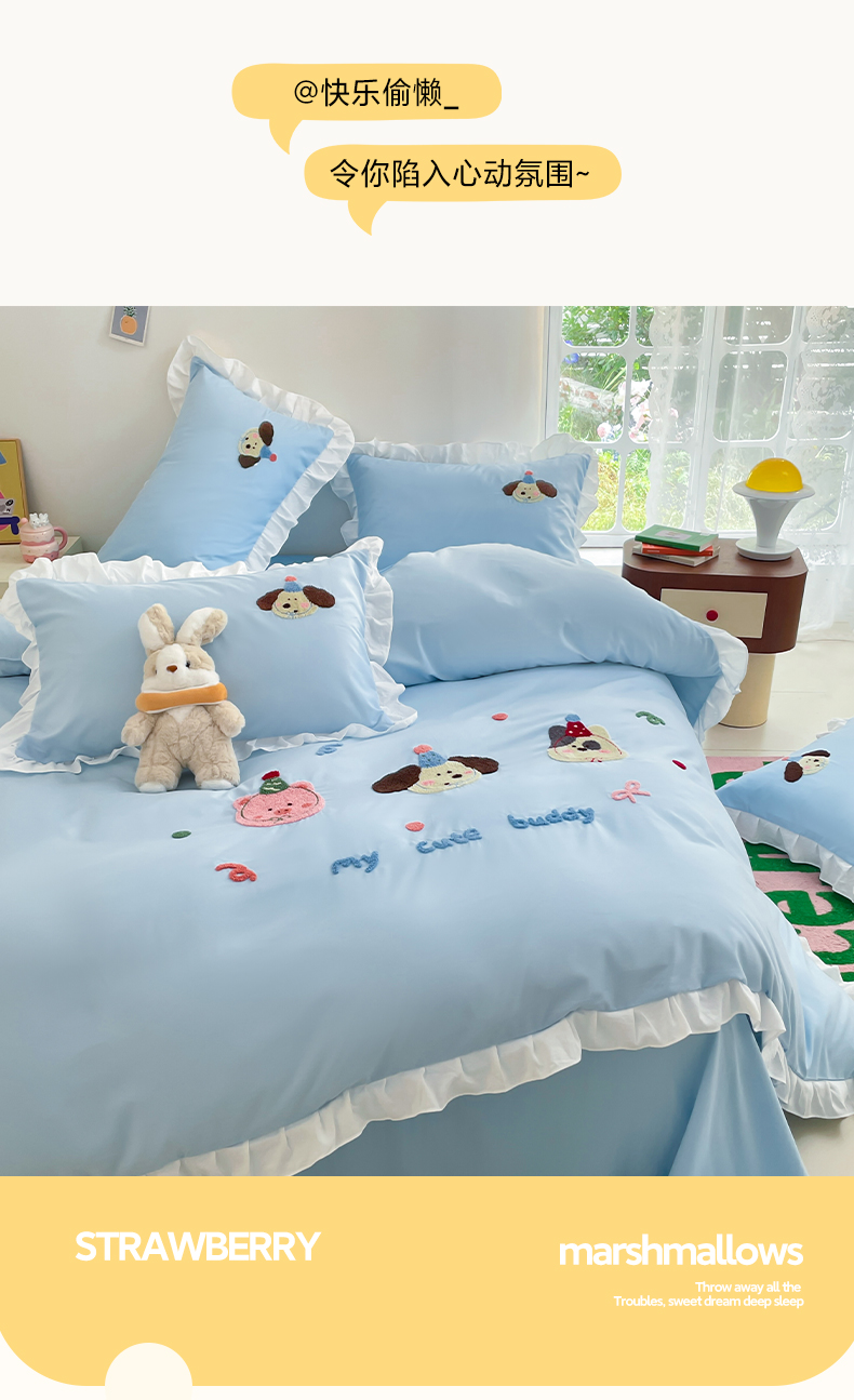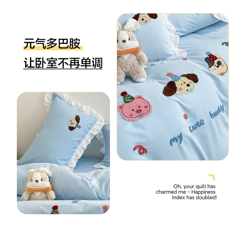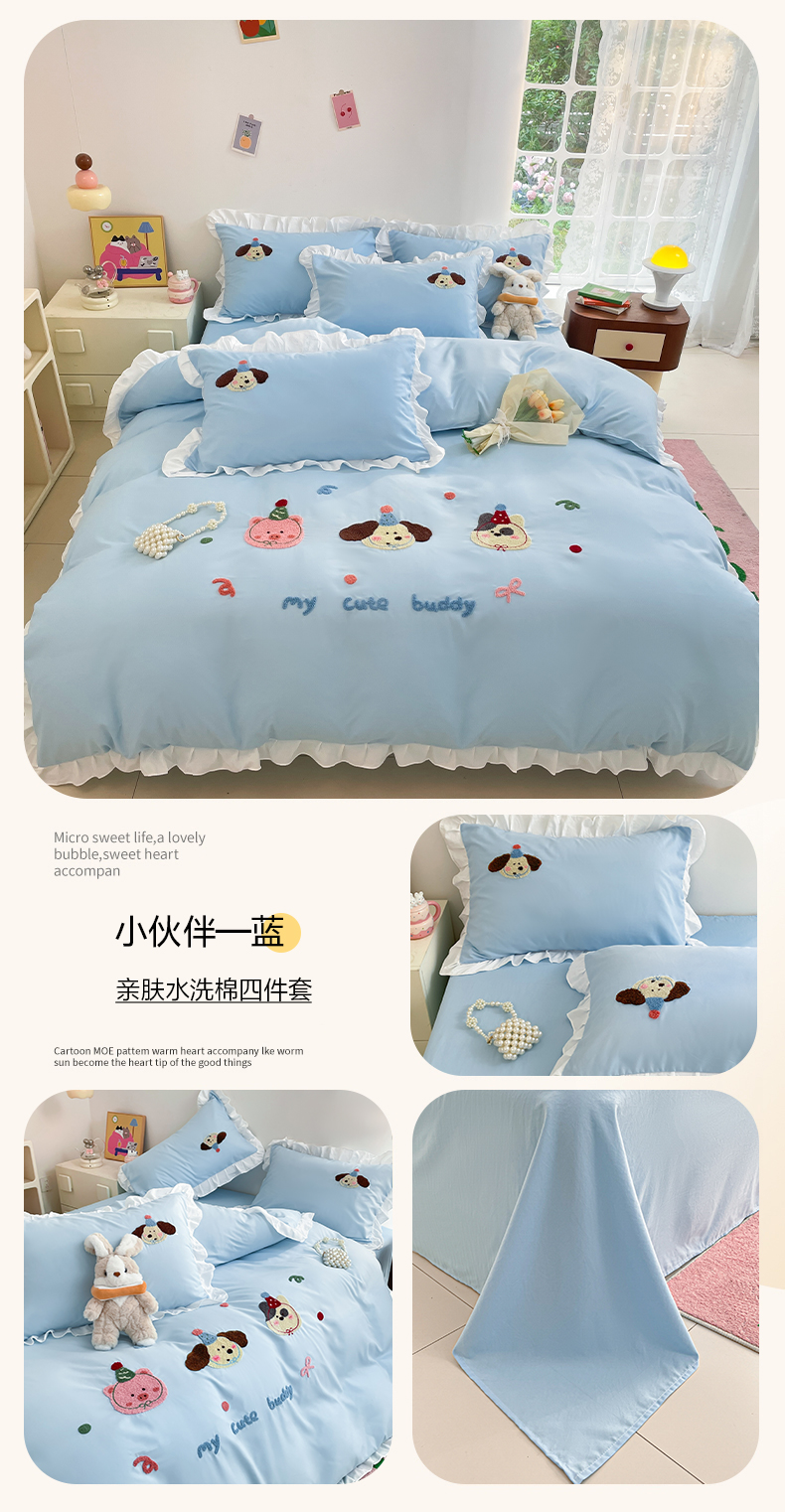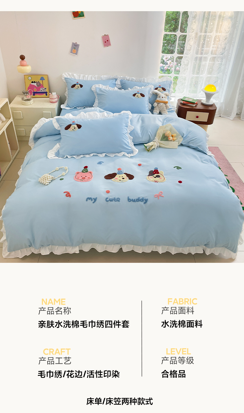 当前位置: 91家纺网 > 商品网购 > 床品套件 > 四件套 > 毛巾绣四件套 > 易禾家纺 2024新款专板花型亲肤水洗棉毛巾绣花边四件套-小伙伴 小伙伴-蓝