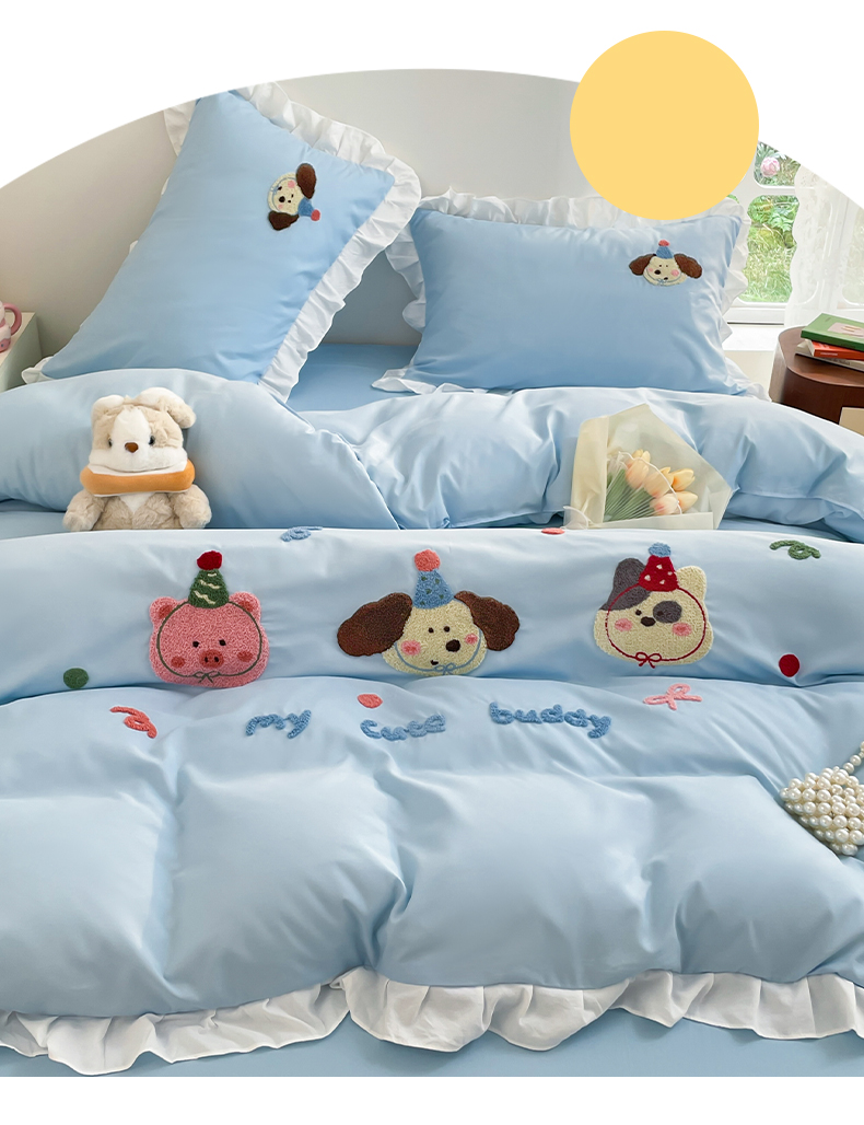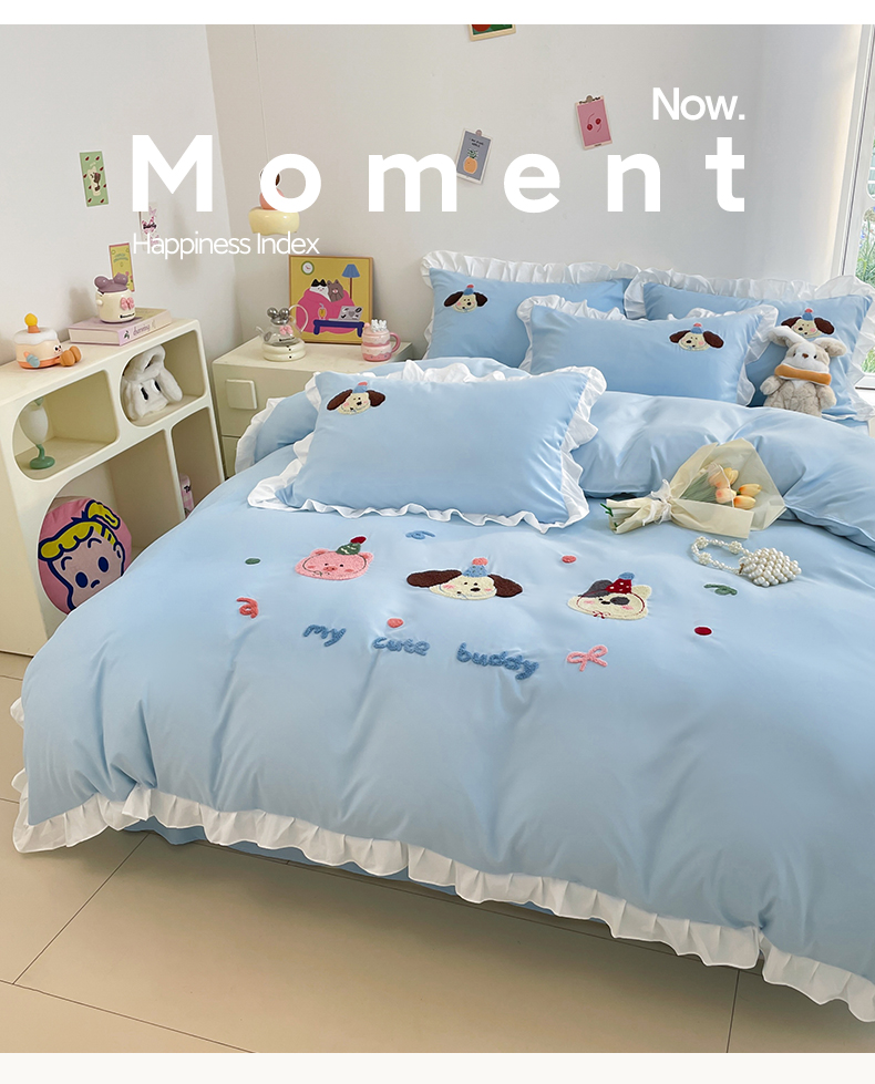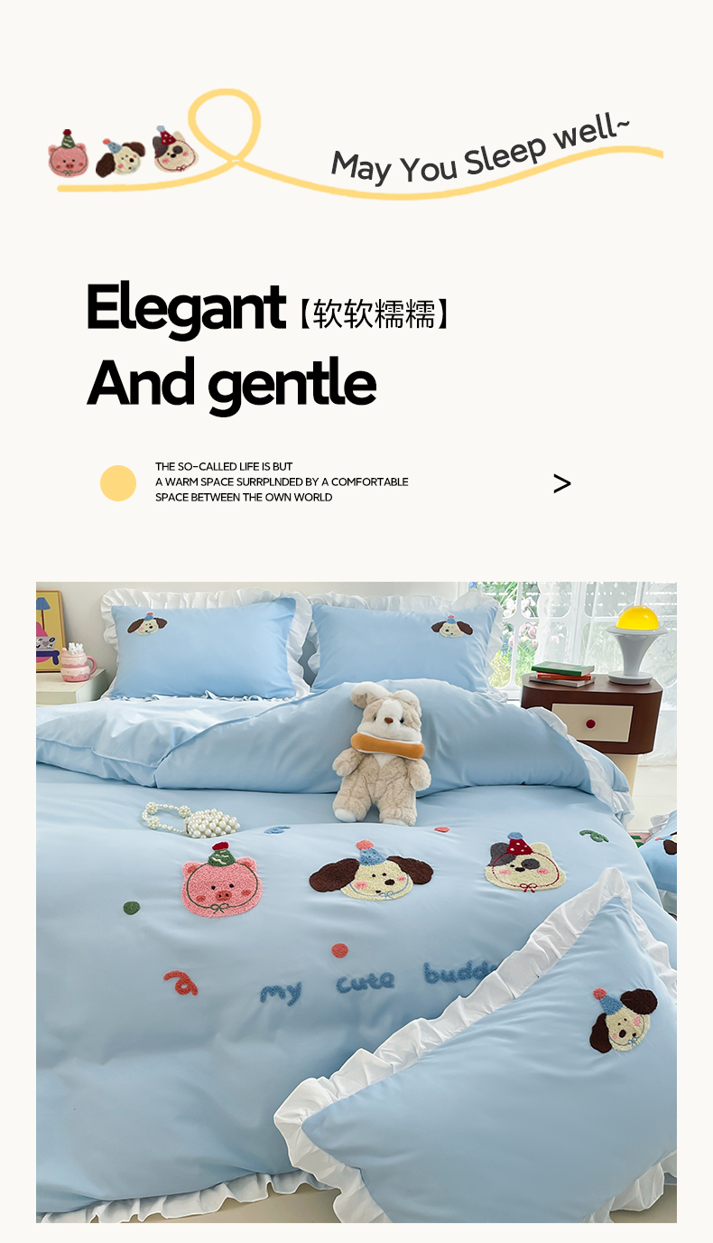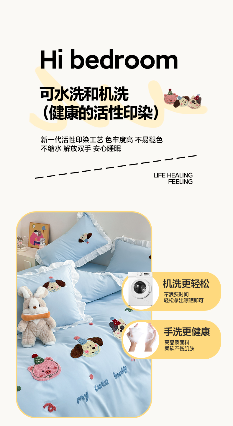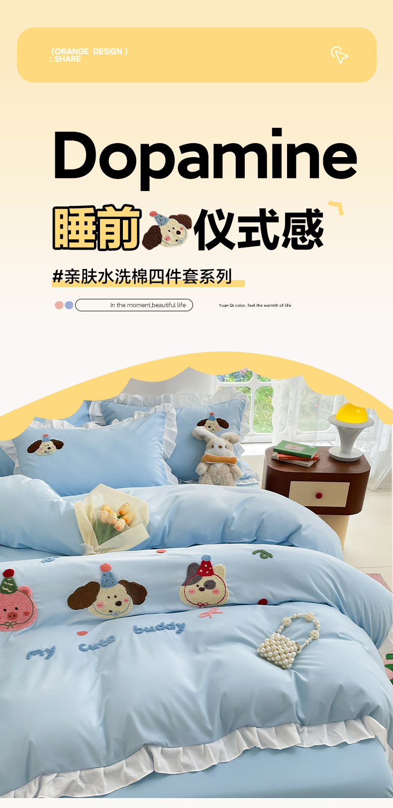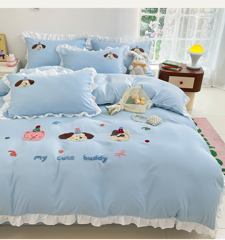 当前位置: 91家纺网 > 商品网购 > 床品套件 > 四件套 > 毛巾绣四件套 > 易禾家纺 2024新款专板花型亲肤水洗棉毛巾绣花边四件套-小伙伴 小伙伴-蓝