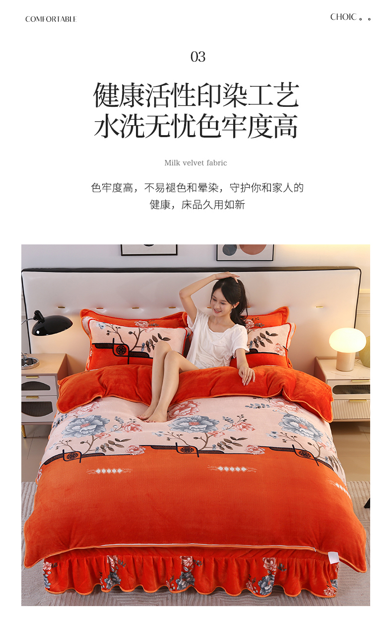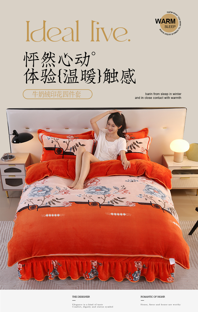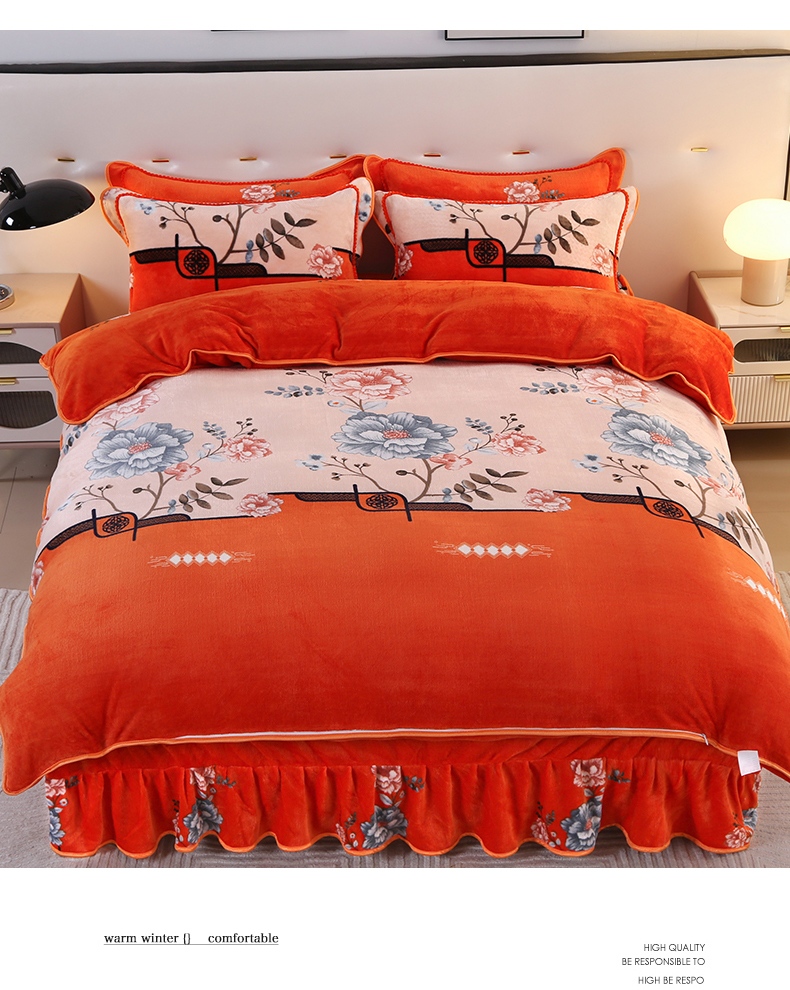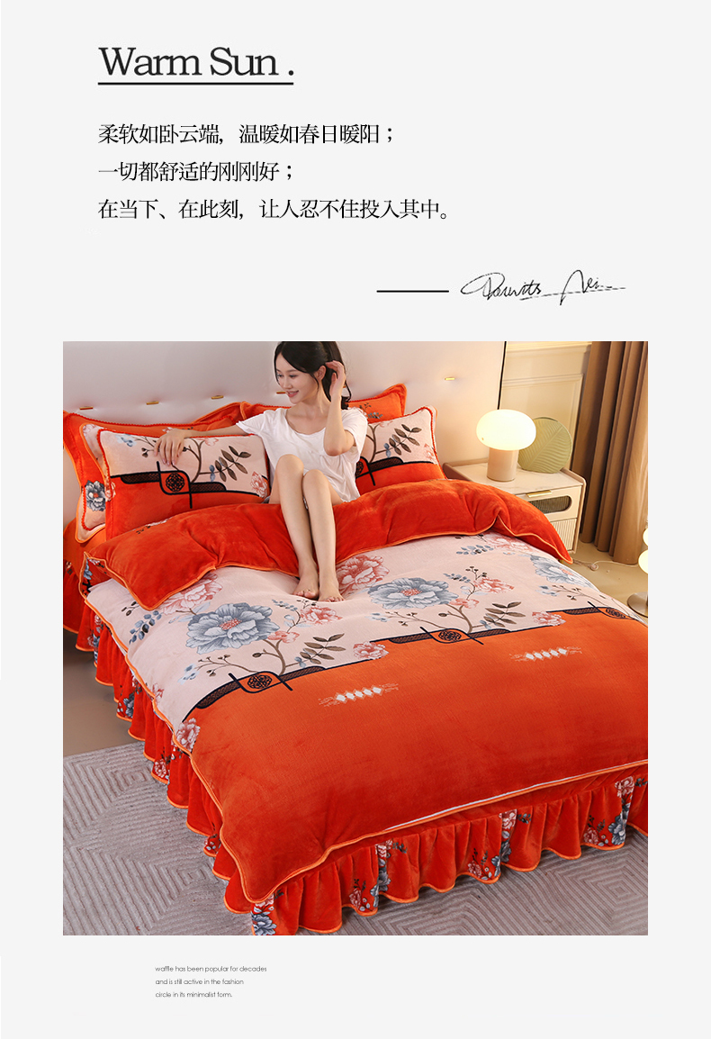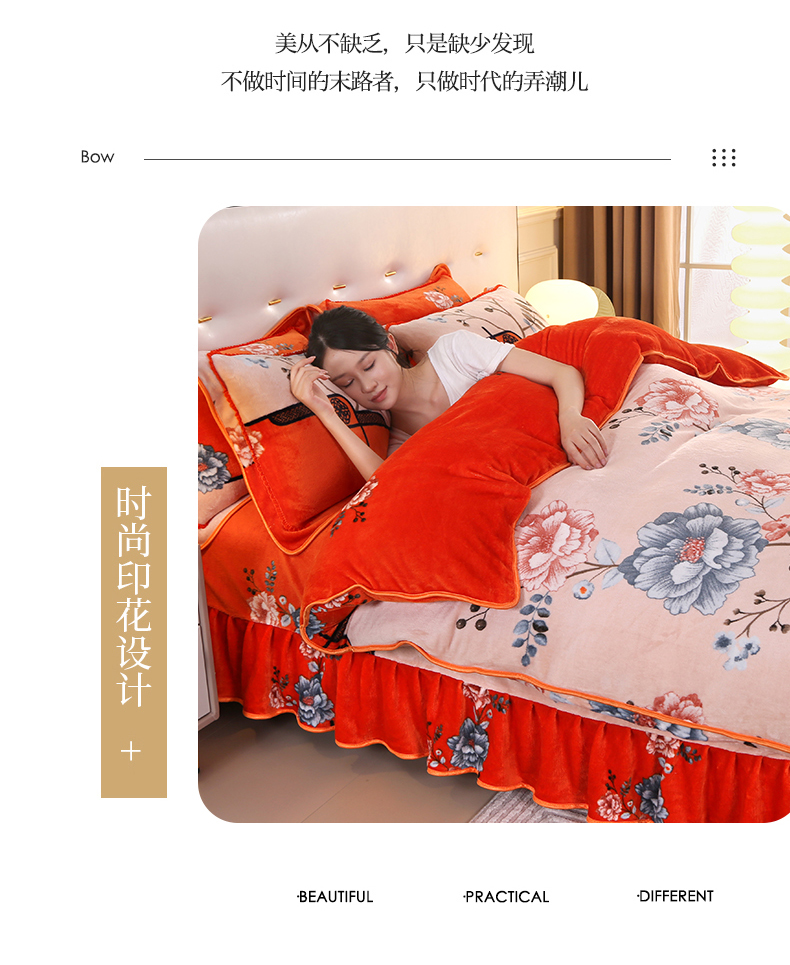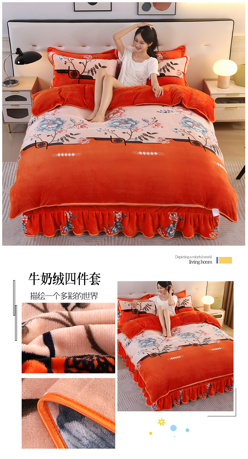 代芙家纺 7斤重牛奶绒金貂四件套抗静电法莱绒珊瑚绒床裙 国色天香
