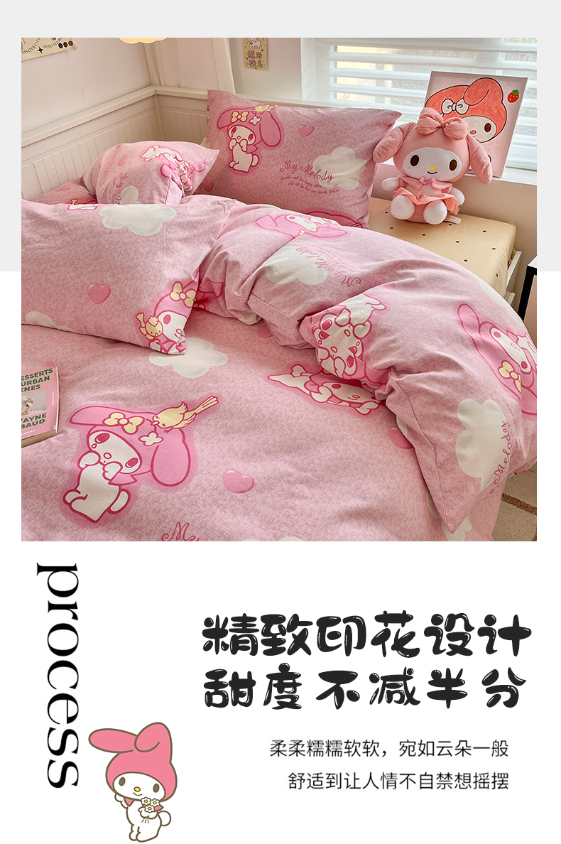 当前位置: 91家纺网 > 商品网购 > 床品套件 > 四件套 > 普通磨毛四件套 > 卧趣家纺 2024秋冬新款三丽鸥正版授权原棉磨毛卡通系列四件套 开心美乐蒂