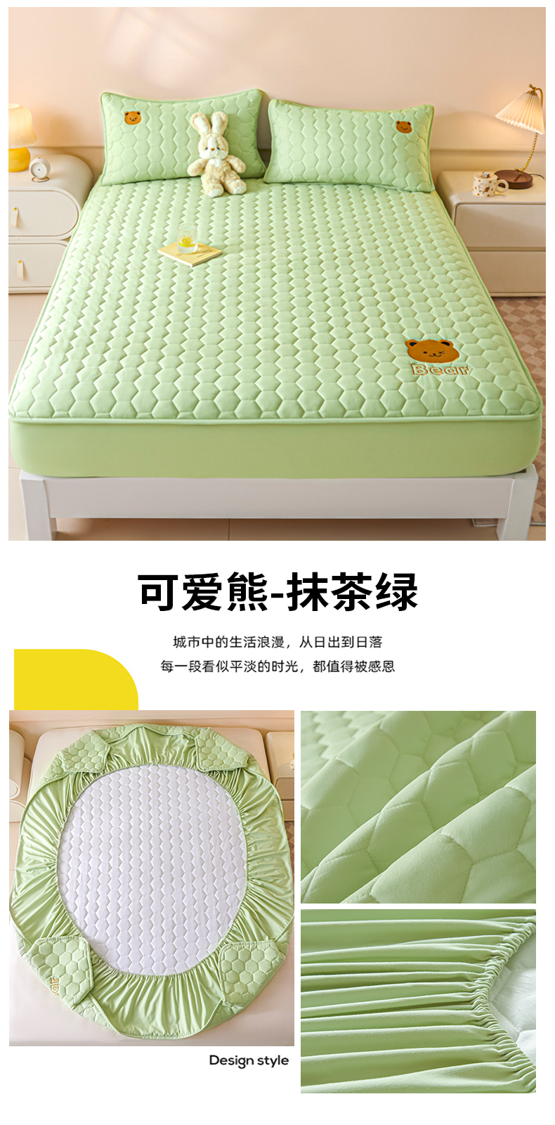 • 91家纺网 家纺一手货源 找家纺 九亭家纺 2024新款A类大豆刺绣夹棉床笠 可爱熊-抹茶绿