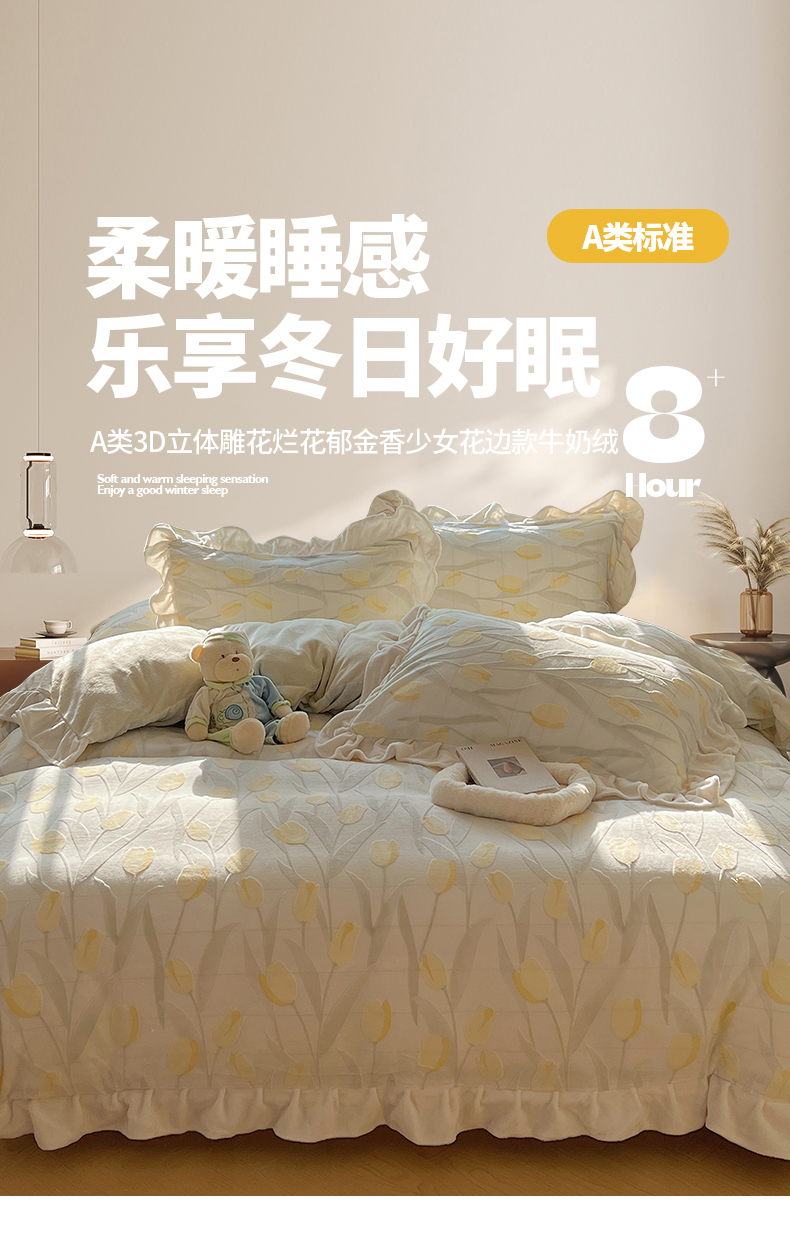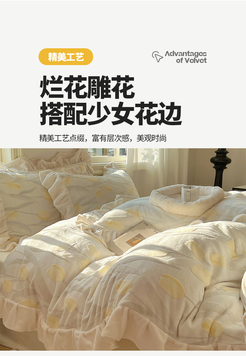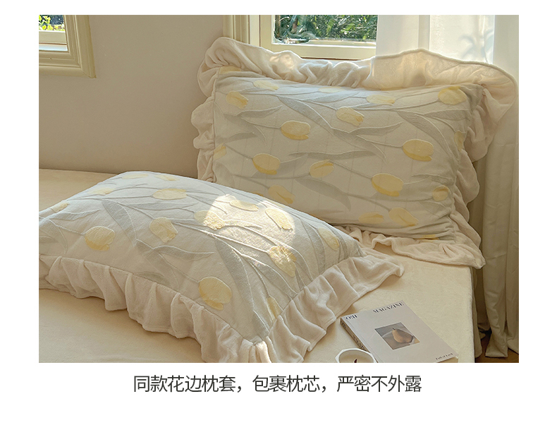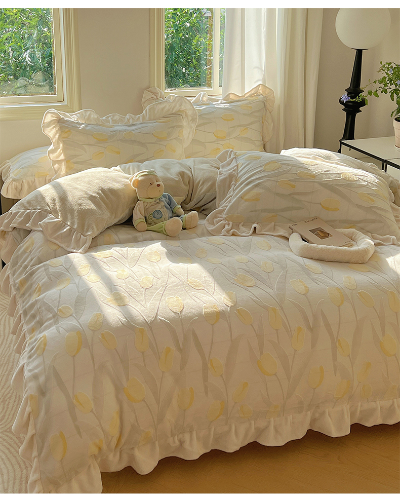 当前位置: 91家纺网 > 商品网购 > 床品套件 > 四件套 > 牛奶绒四件套 > 桃子家居 2024新款A类高克重230克3D立体雕花烂花提花着色郁金香少女花边款简单款牛奶绒四件套 绒花边烂花-郁金香奶油黄