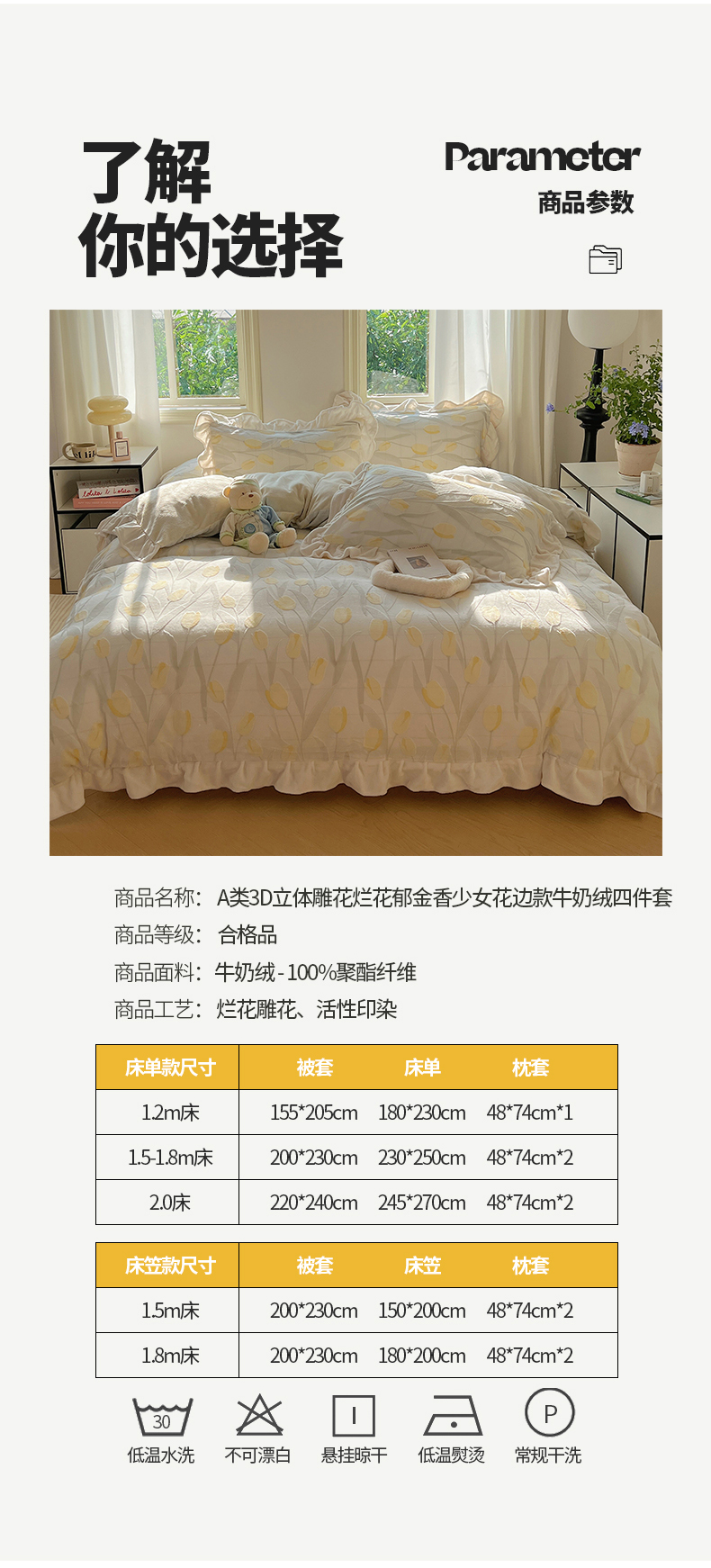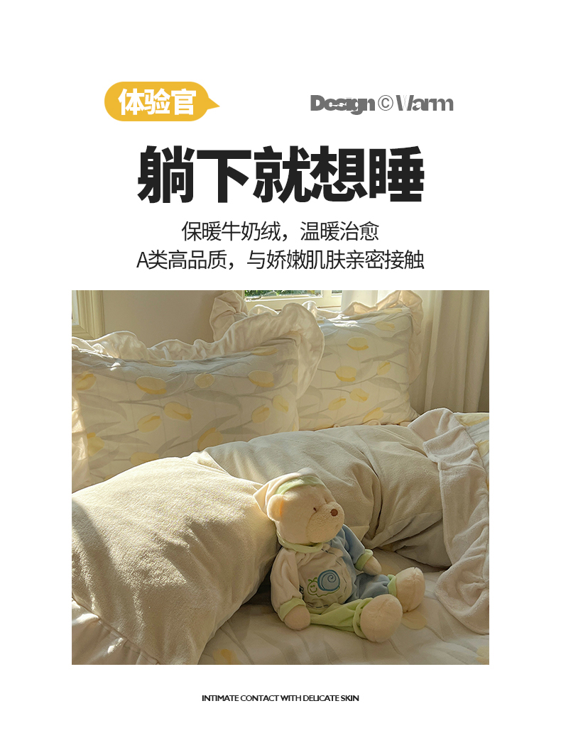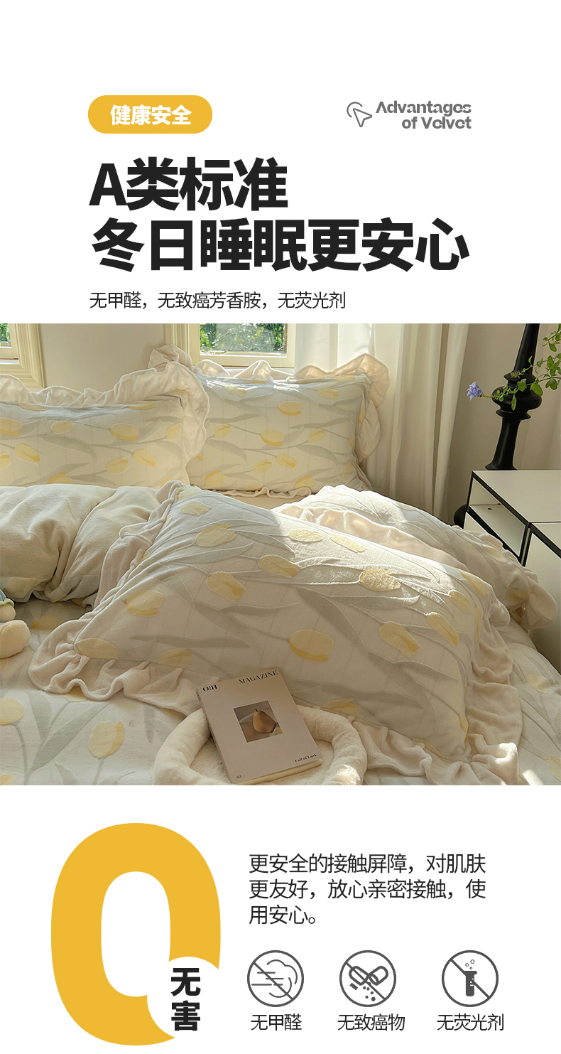 当前位置: 91家纺网 > 商品网购 > 床品套件 > 四件套 > 牛奶绒四件套 > 桃子家居 2024新款A类高克重230克3D立体雕花烂花提花着色郁金香少女花边款简单款牛奶绒四件套 绒花边烂花-郁金香奶油黄