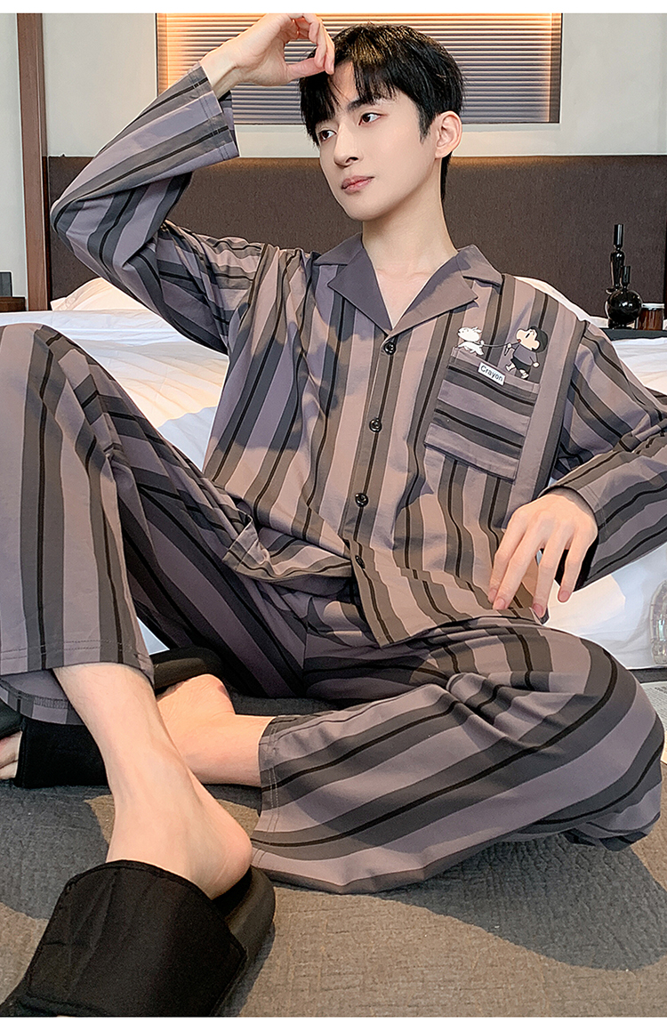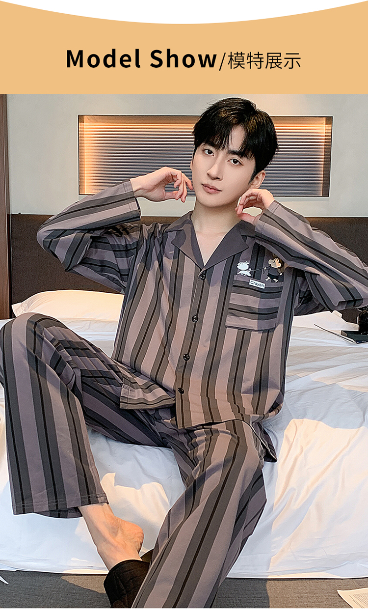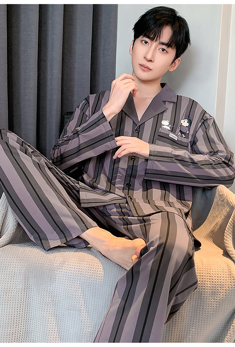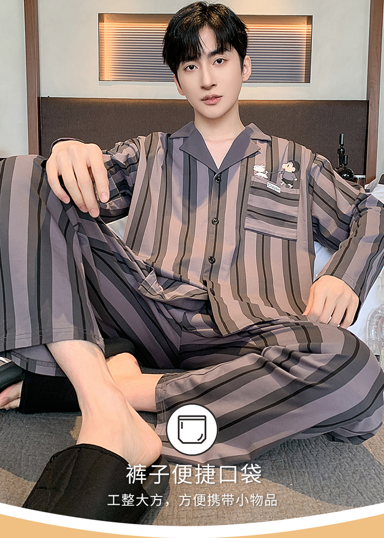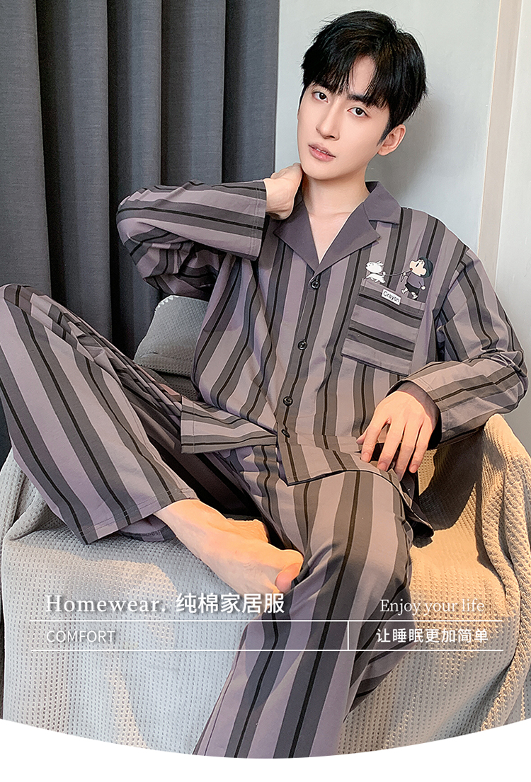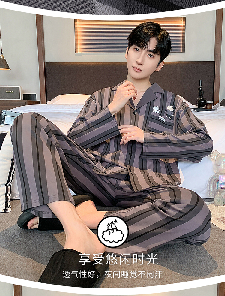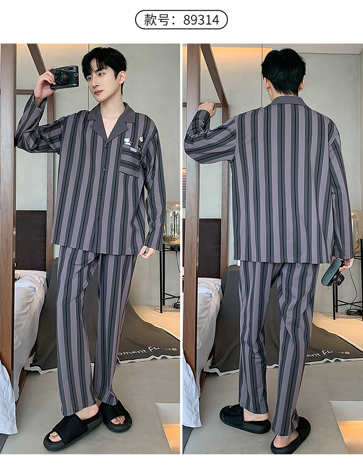 春秋季新款纯棉休闲简约睡衣高级质量家居服夏季男士宽松舒适睡衣翻领 89314