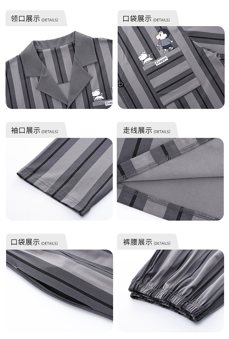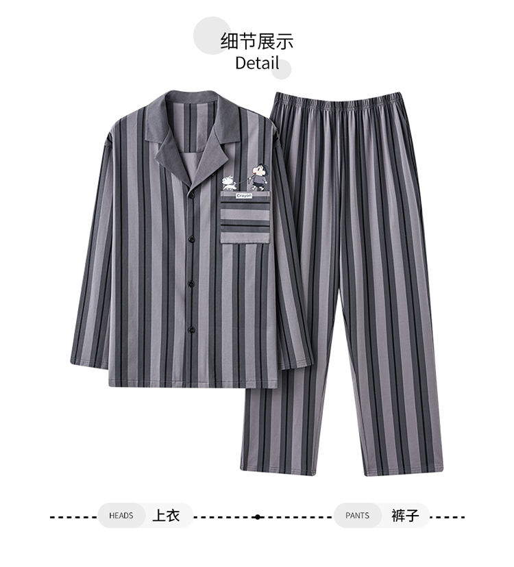 (总)洛兰沙家居馆 2025新款【松木】男士长袖长裤套装日系简约家居服全棉双层色织提花棉纱款,松木-灰色