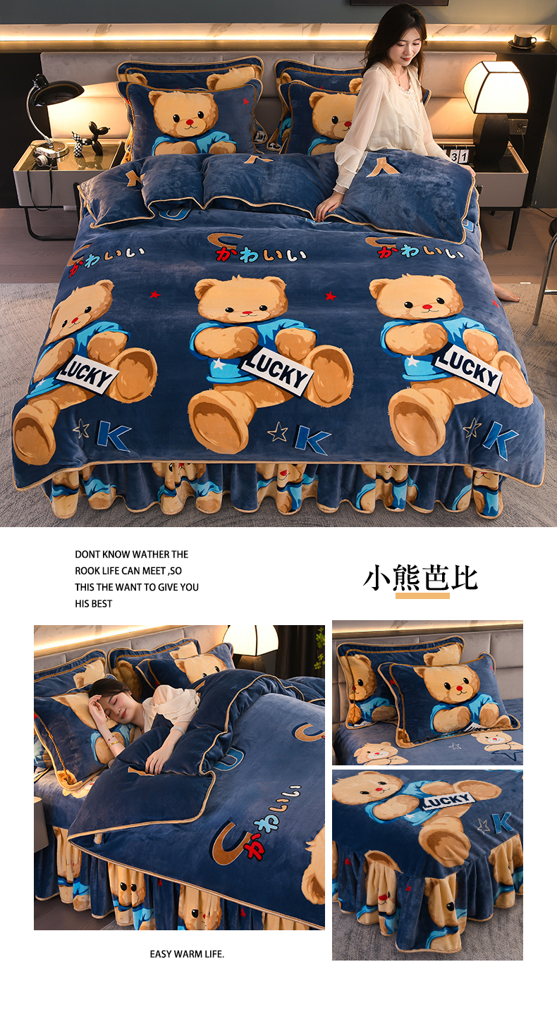 商品名称:曼尼家 2025高克重直播印花床裙款法莱绒金貂珊瑚绒牛奶绒四件套 小熊芭比