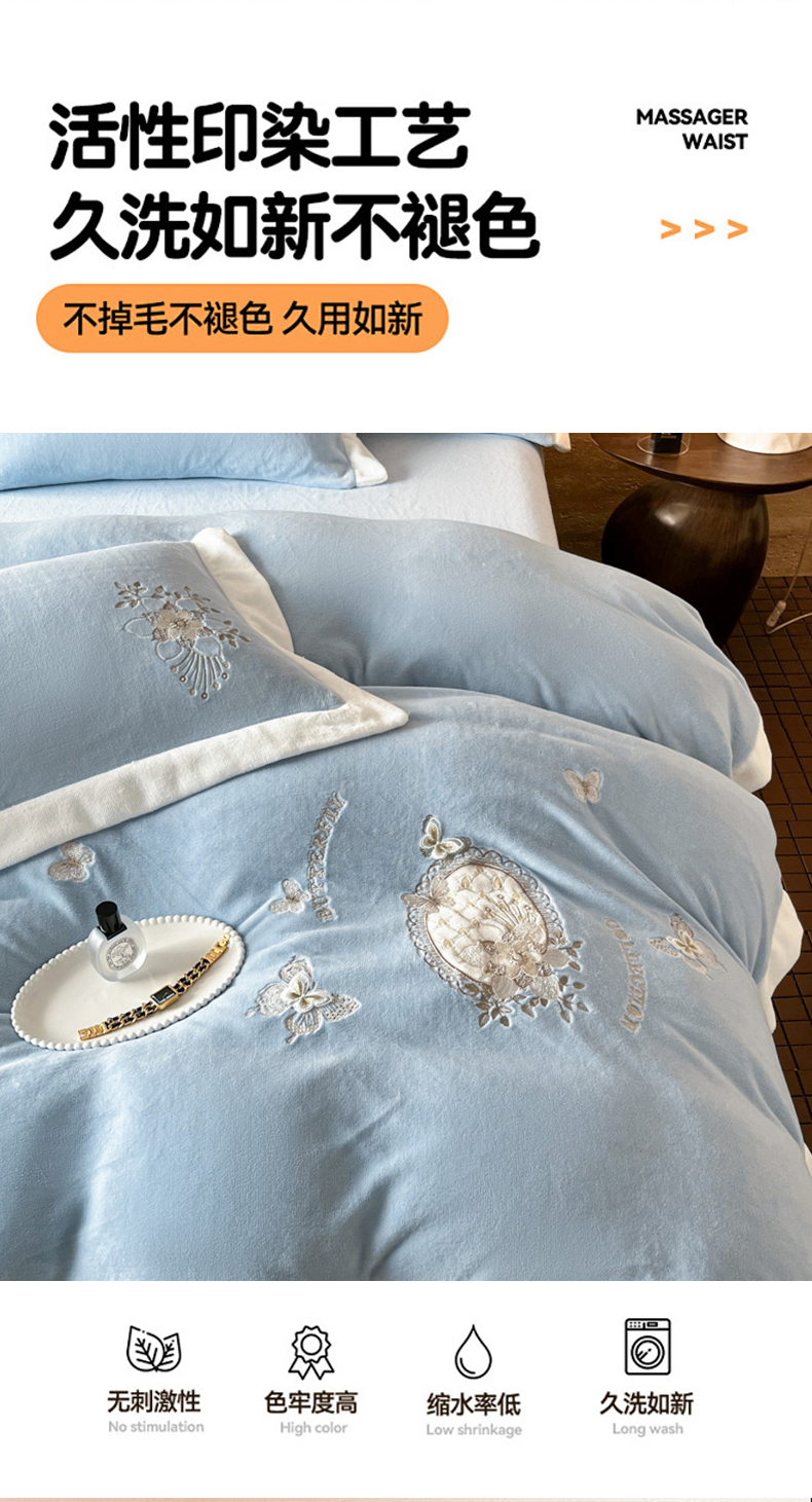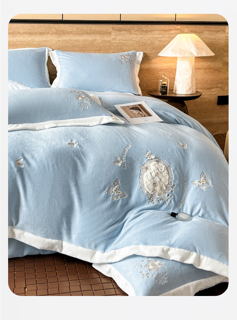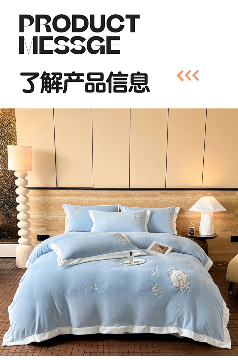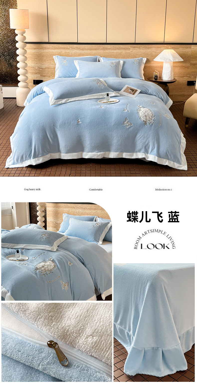 商品名称:恋佳居 2025新款牛奶绒高克重平绣四件套 蝶儿飞-蓝