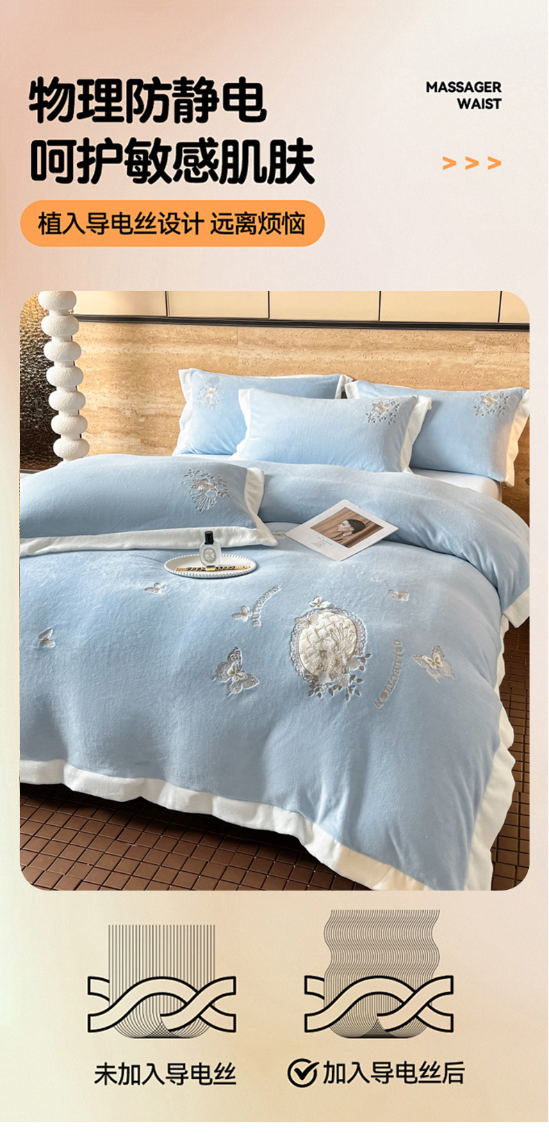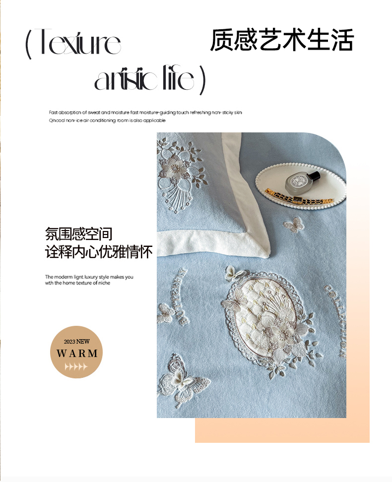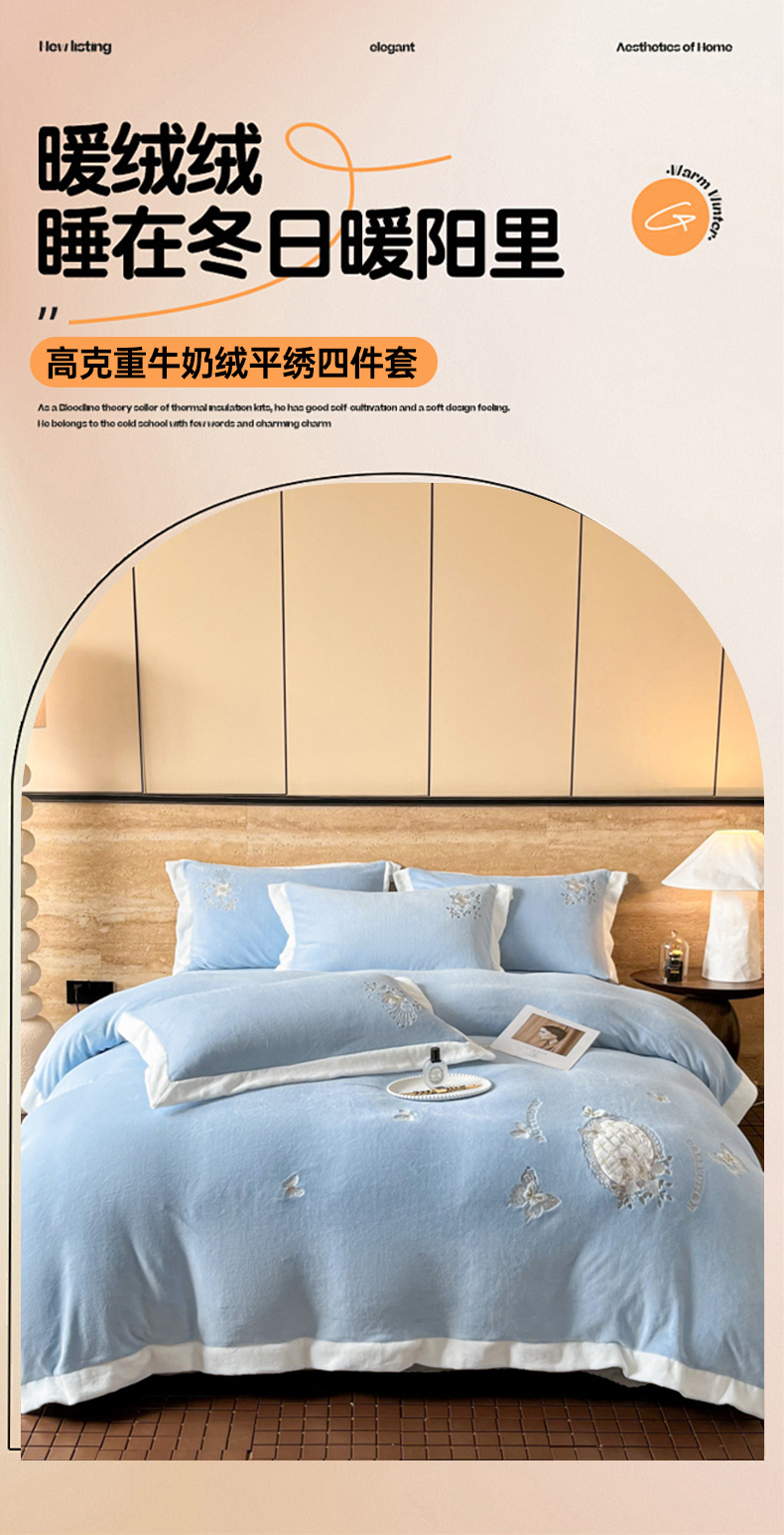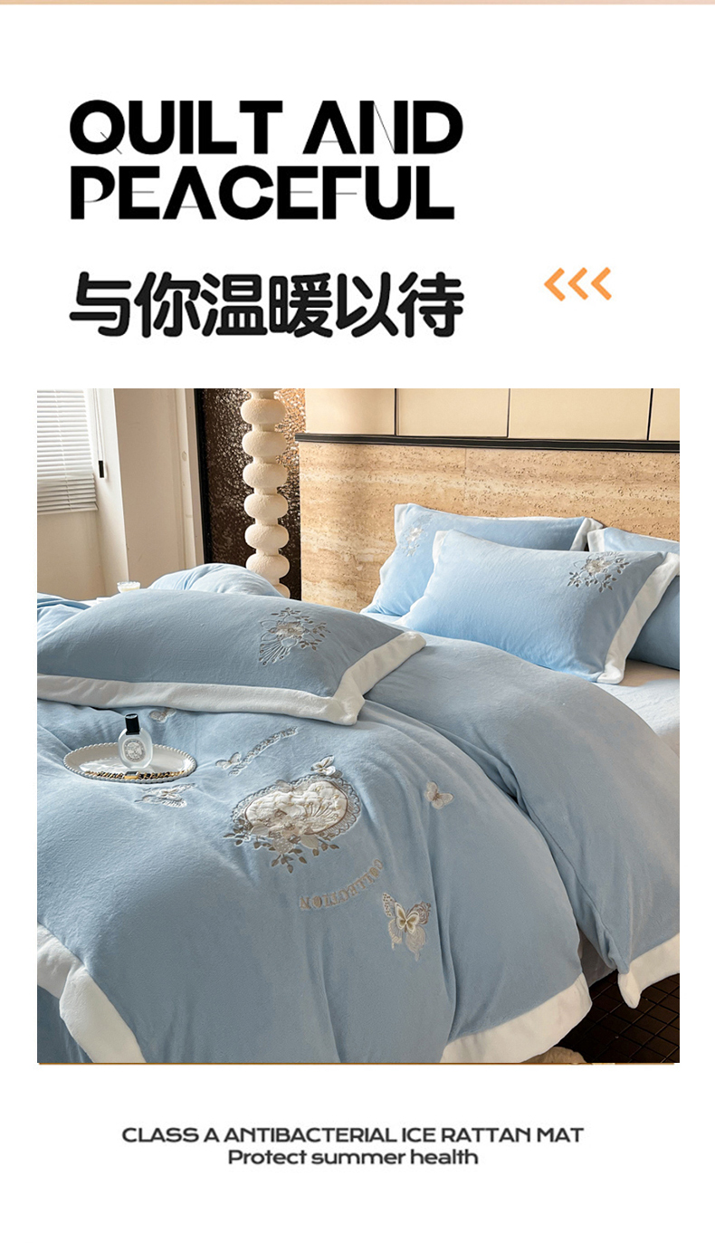 商品名称:恋佳居 2025新款牛奶绒高克重平绣四件套 蝶儿飞-蓝
