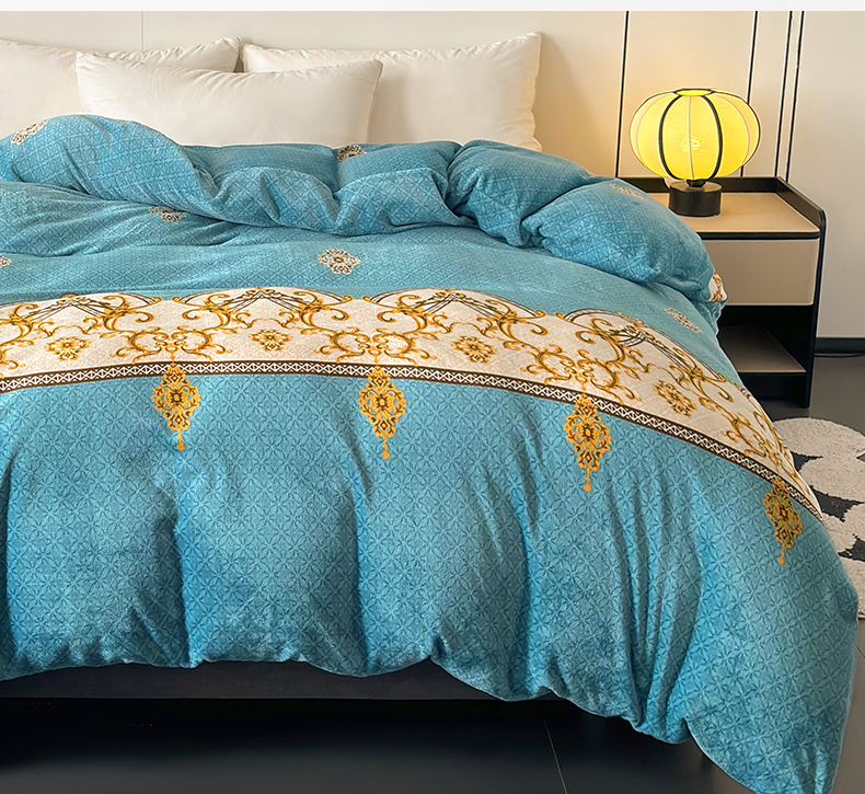 商品名称:董韵家纺 2025新款高克重全消光牛奶绒法莱绒金貂绒印花单品被套床裙四件套(提供买家秀)欧风墨雨