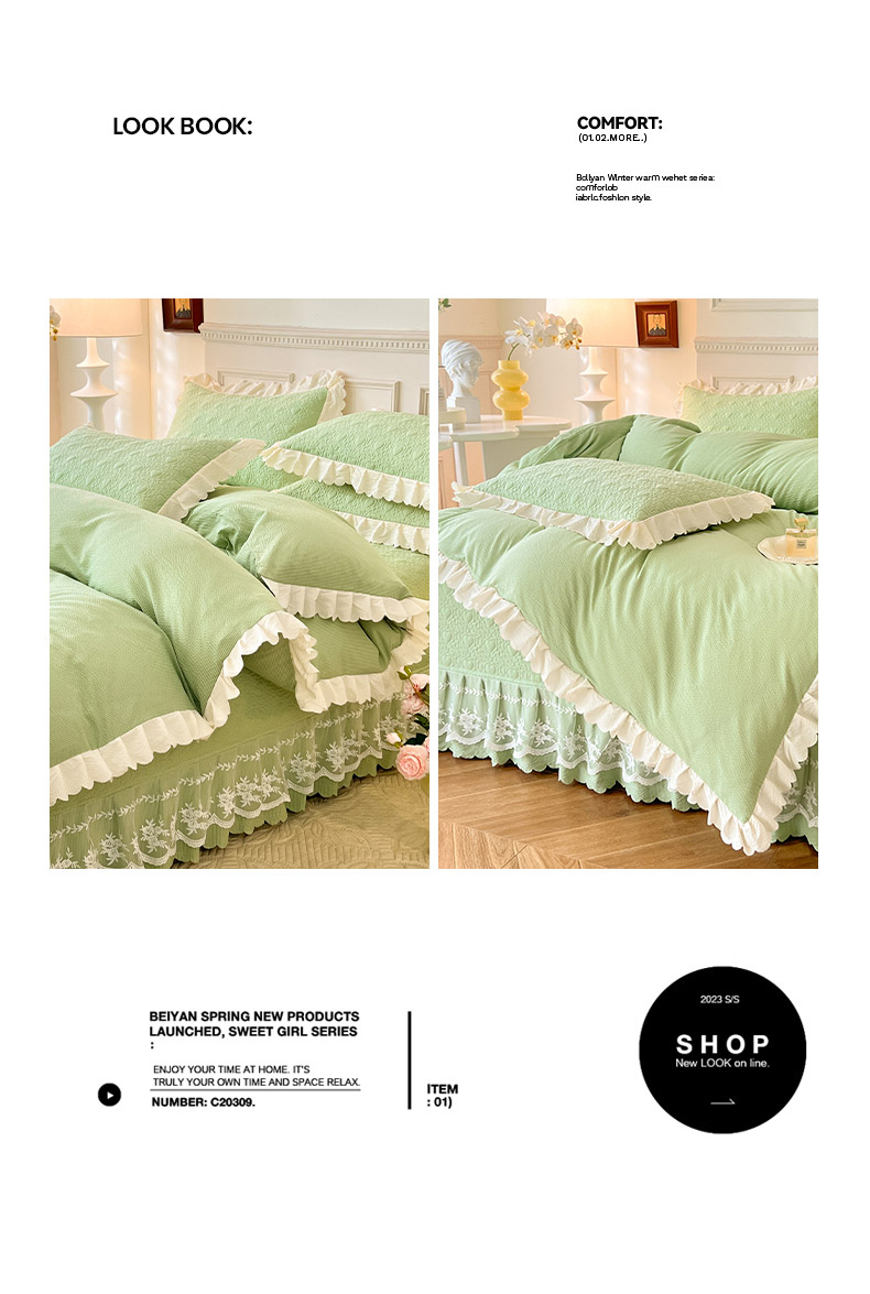当前位置: 91家纺网 > 商品网购 > 床品套件 > 四件套 > 其它四件套 > 绒世界 2024新款秋冬泡泡双层纱夹棉床盖四件套 清新绿