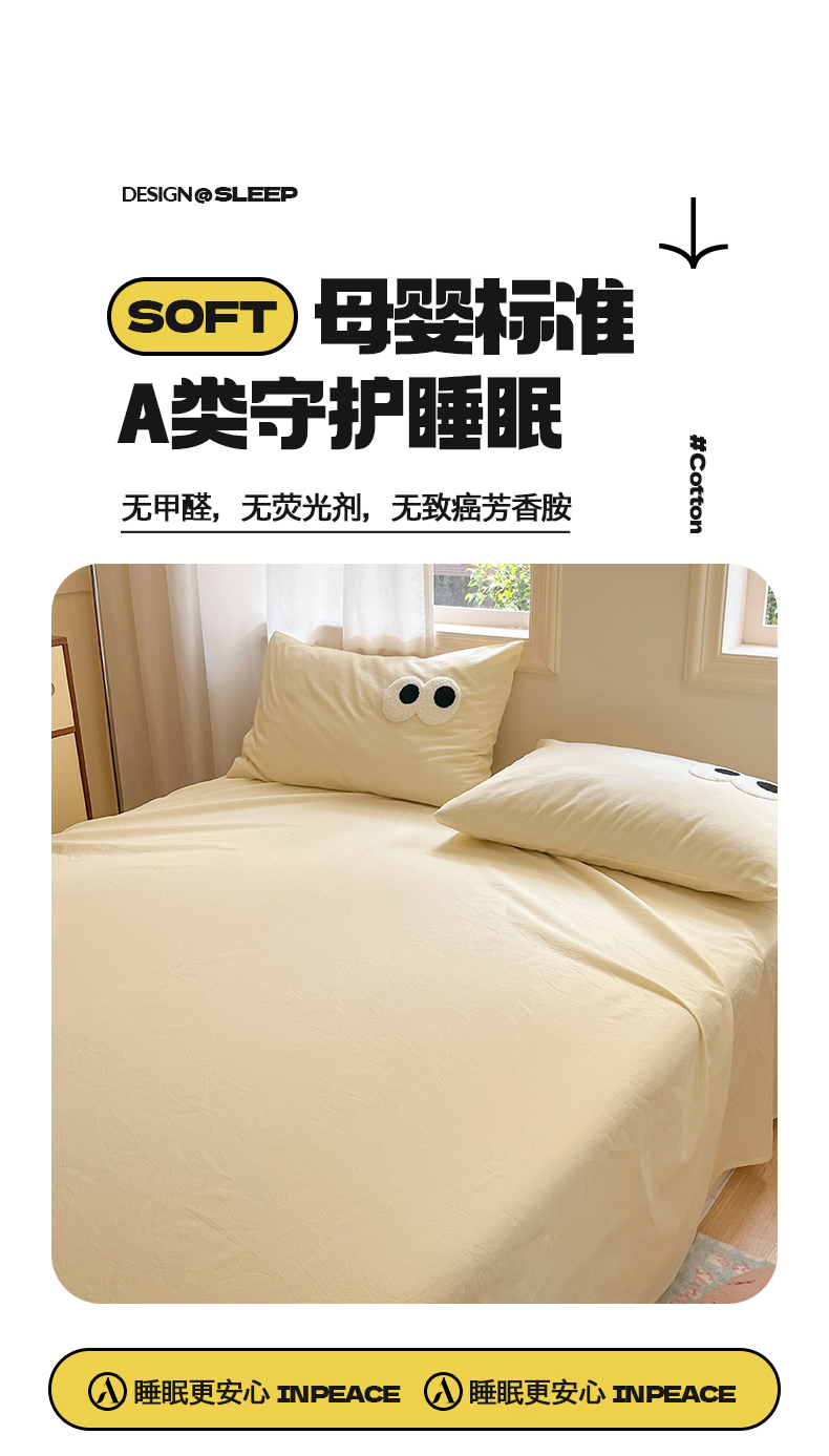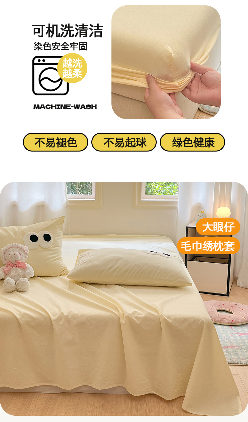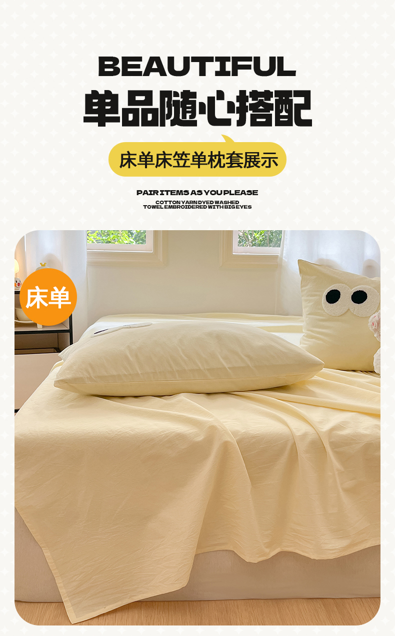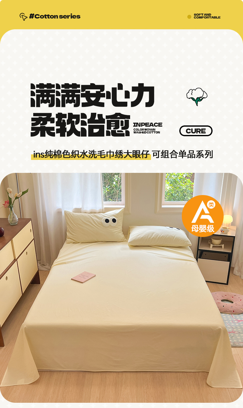 • 91家纺网 家纺一手货源 找家纺 桃子 2024新款ins纯棉色织水洗毛巾绣大眼仔单床笠 色织水洗棉-大眼仔奶黄