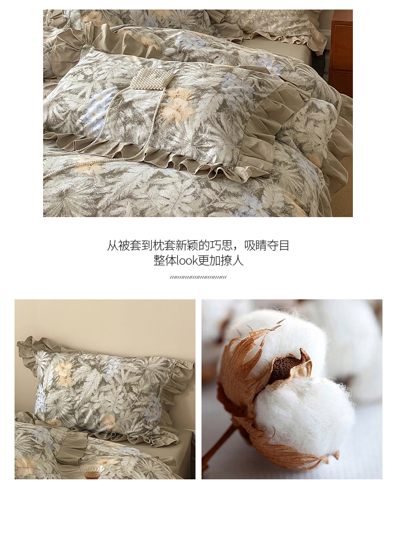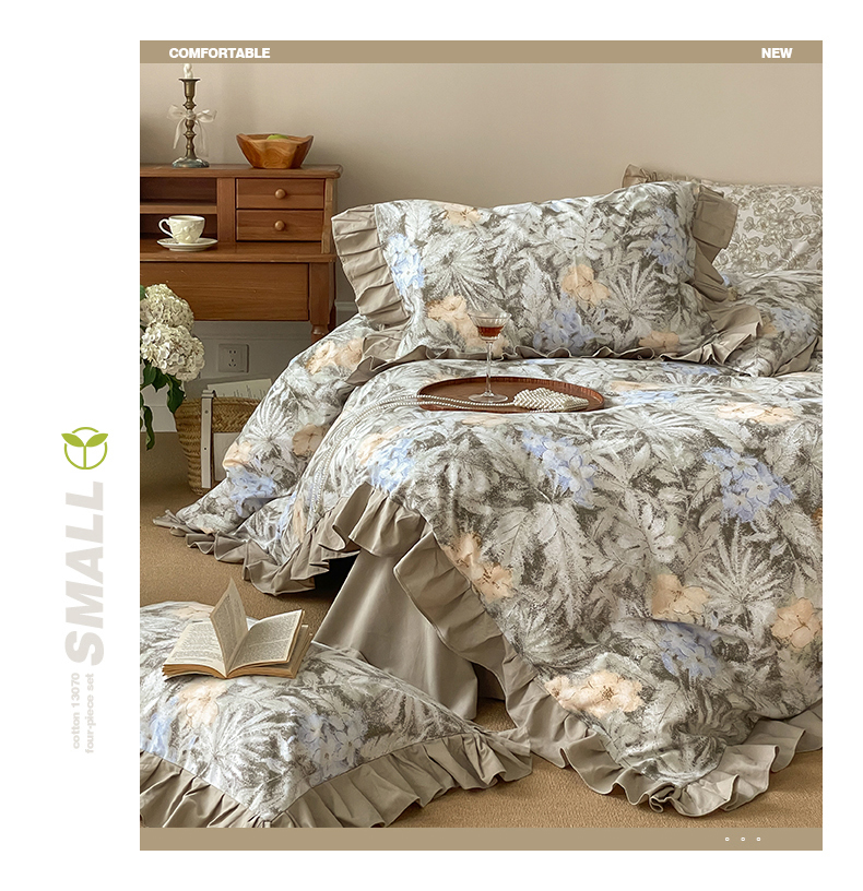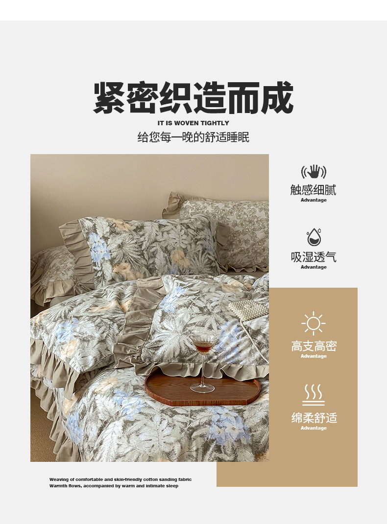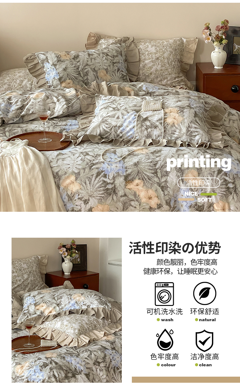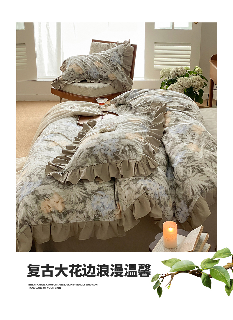 (总)窝米 2025新款数码印花100支长绒棉纯棉工艺花边款四件套-晚意,晚意