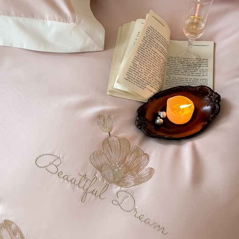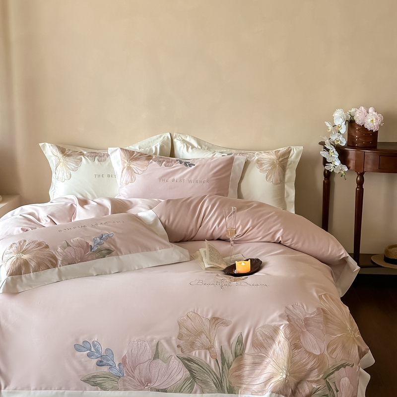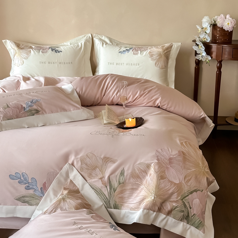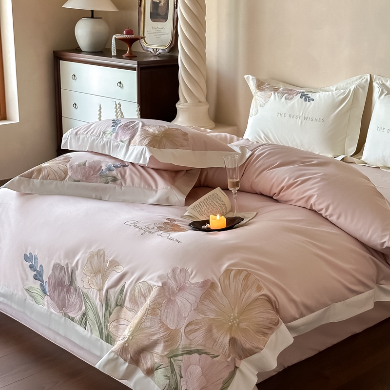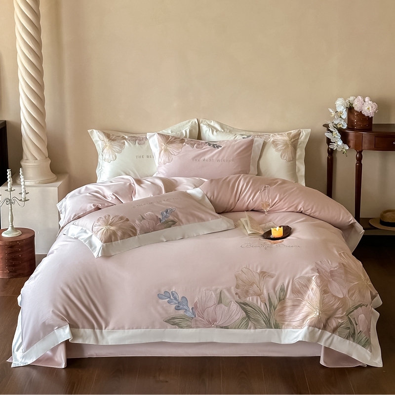 沐晴 2024秋冬新款100支长绒棉纯色绣花宽边工艺款四件套 墨雨云间-粉