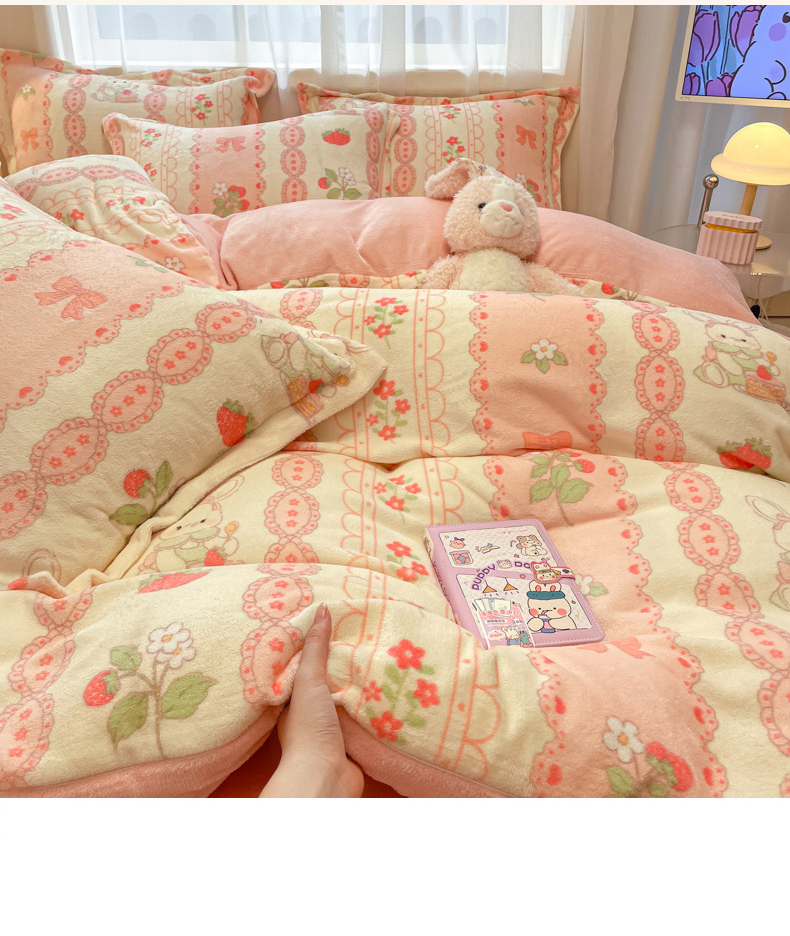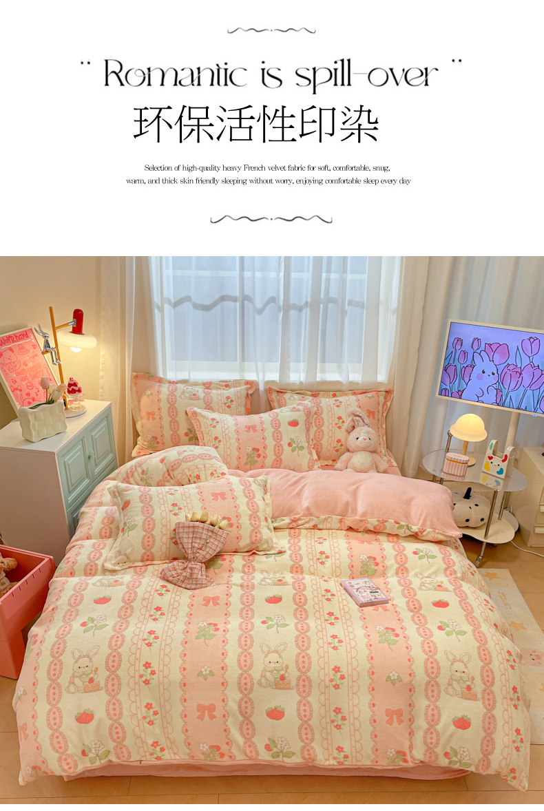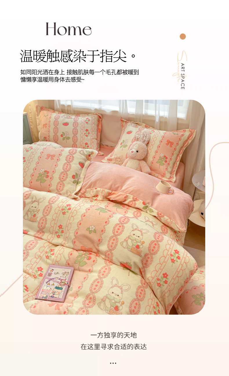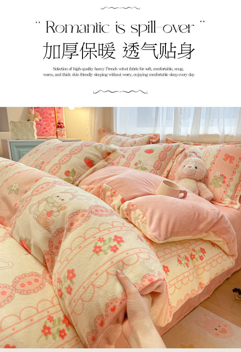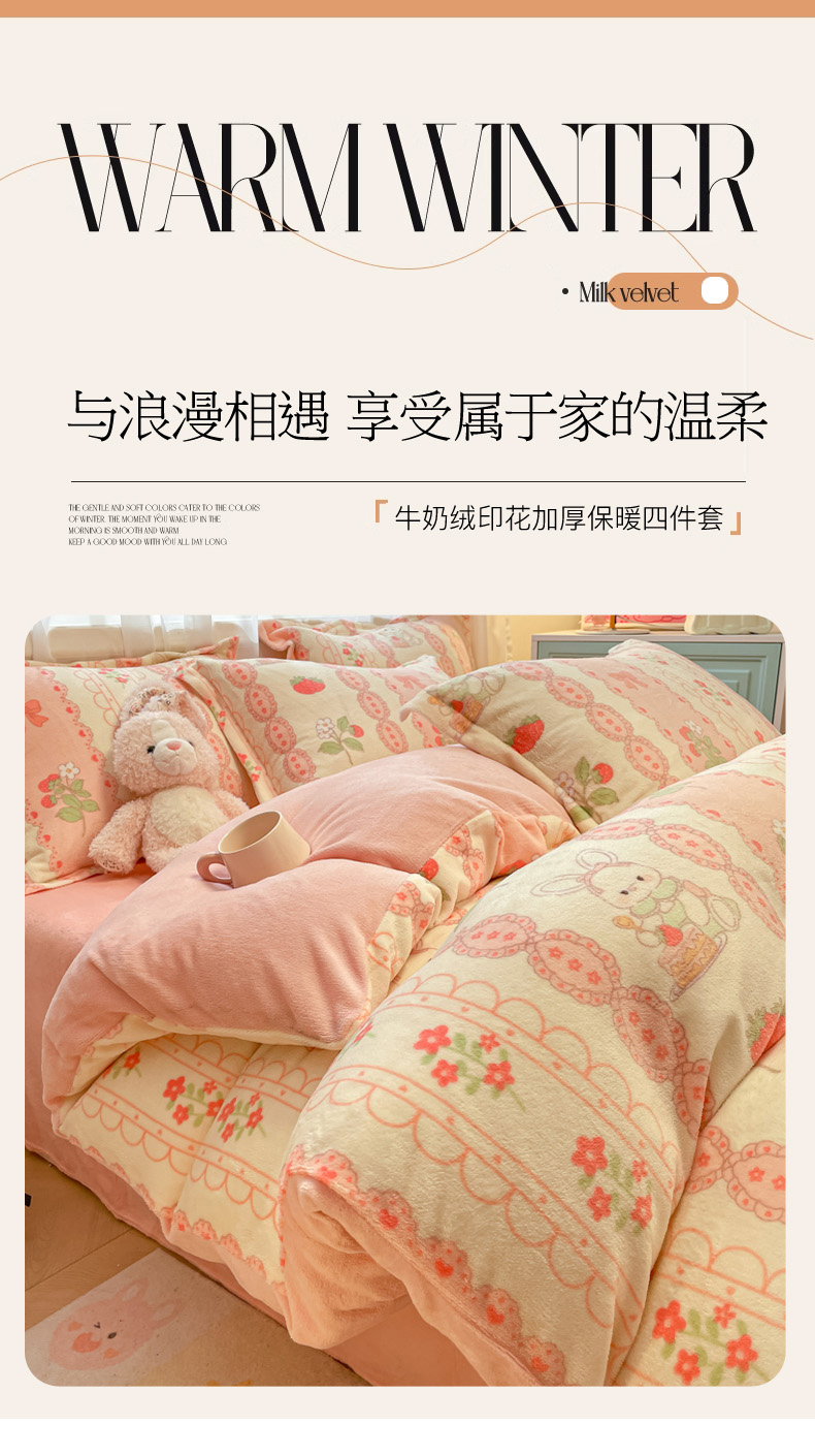 当前位置: 91家纺网 > 商品网购 > 床品套件 > 四件套 > 牛奶绒四件套 > 柒月 2024新款小清新牛奶绒印花加厚保暖四件套 蕾丝兔兔