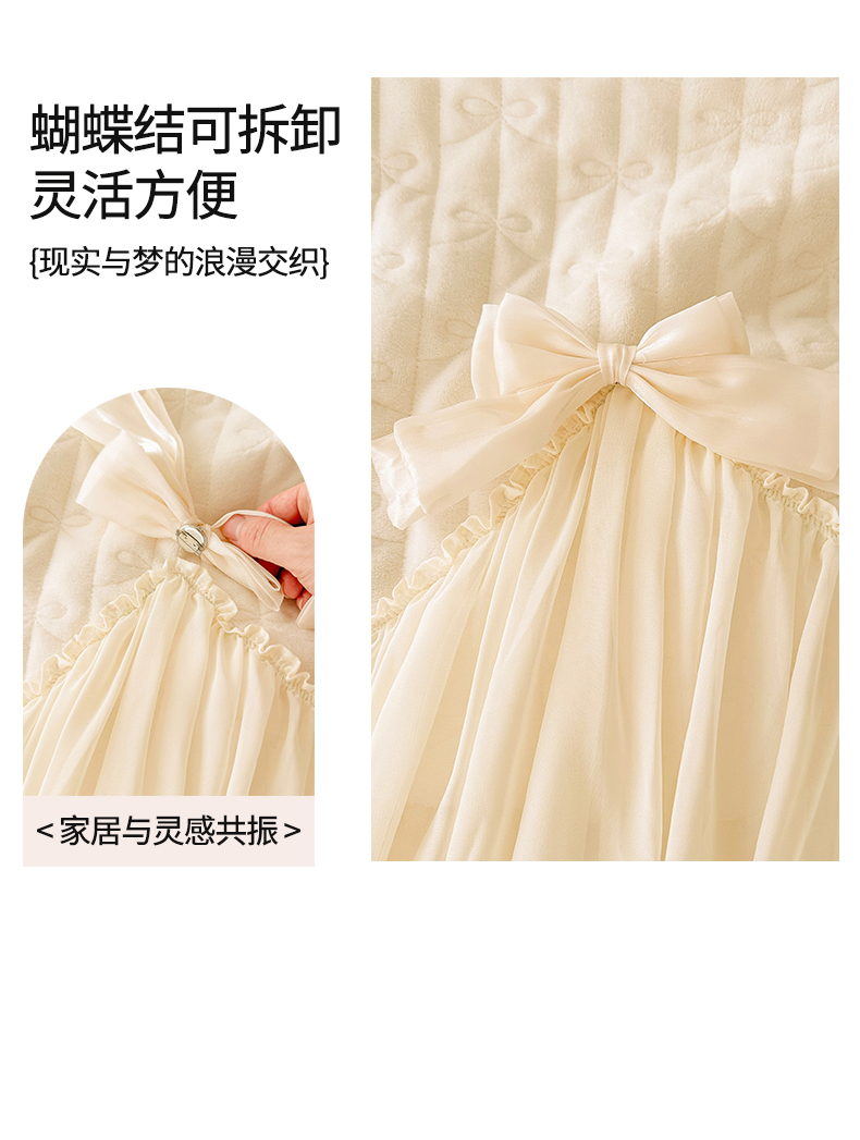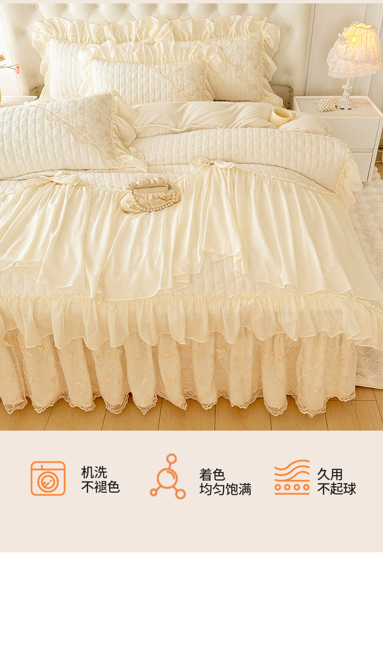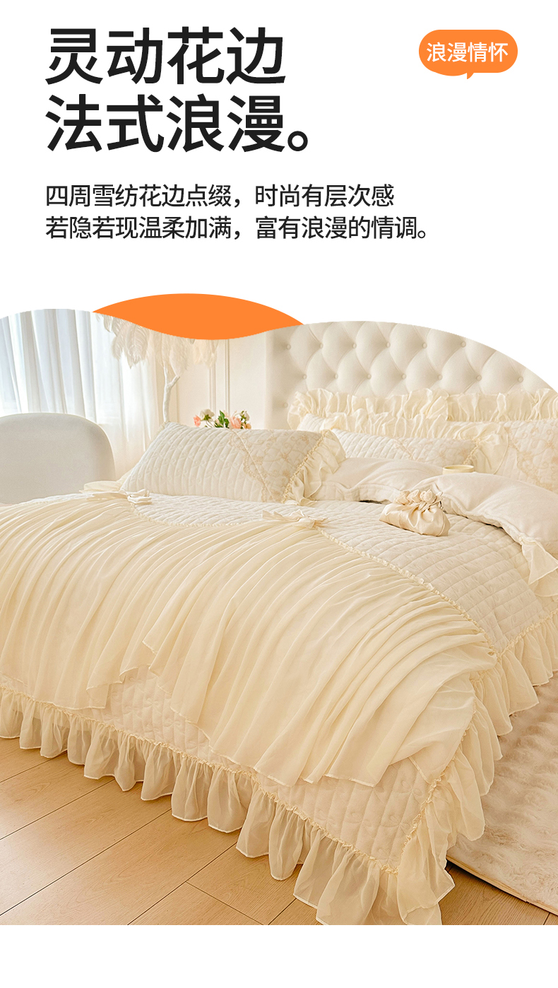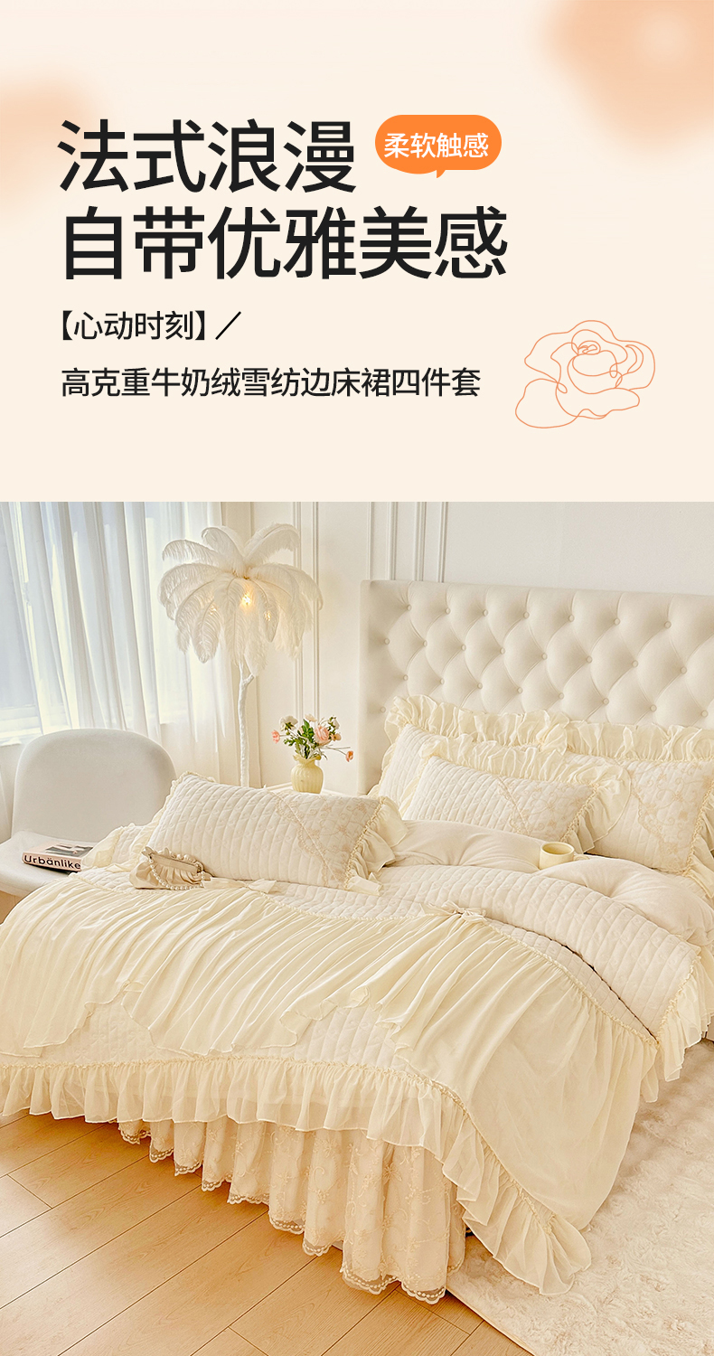 当前位置: 91家纺网 > 商品网购 > 床品套件 > 四件套 > 其它四件套 > 罗艺轩 2024新款高克重牛奶雪纺边床裙四件套-羽蝶 奶昔