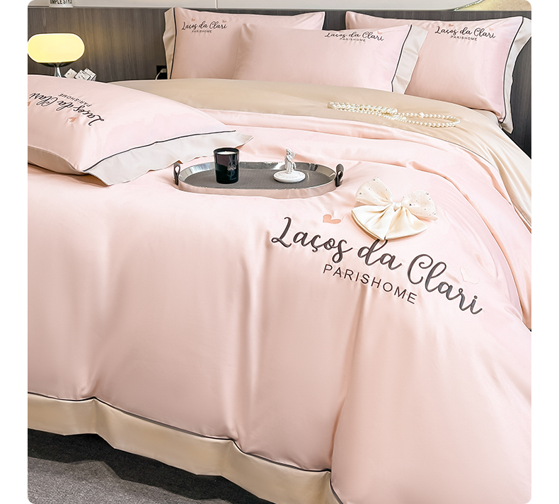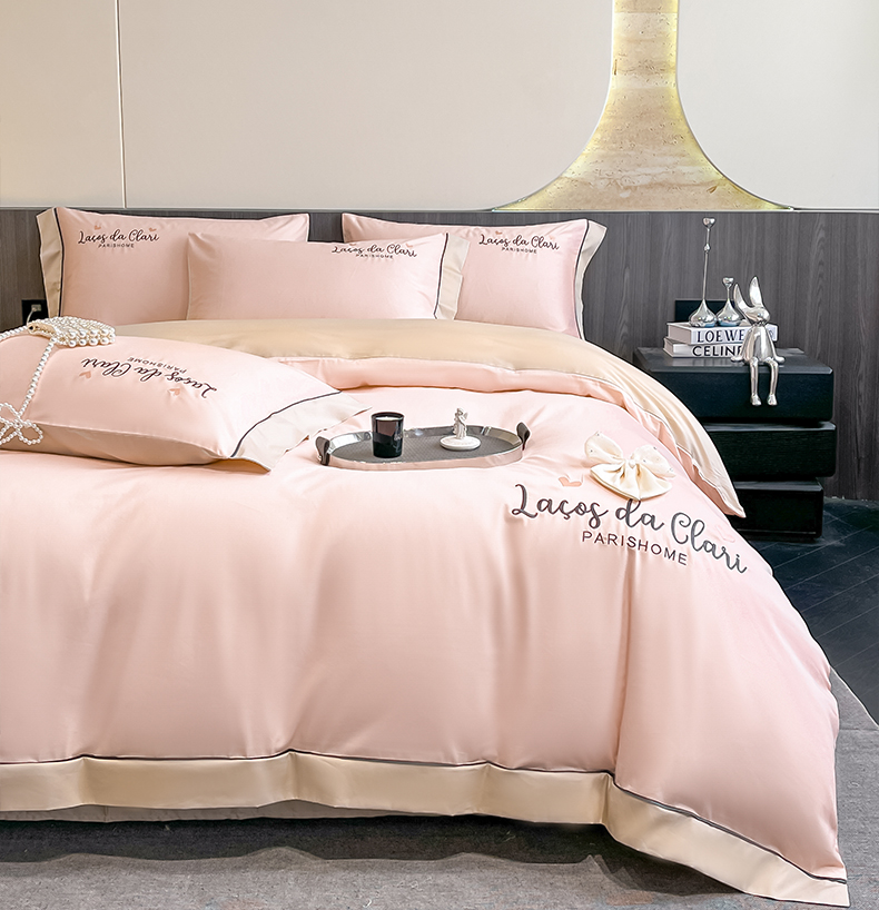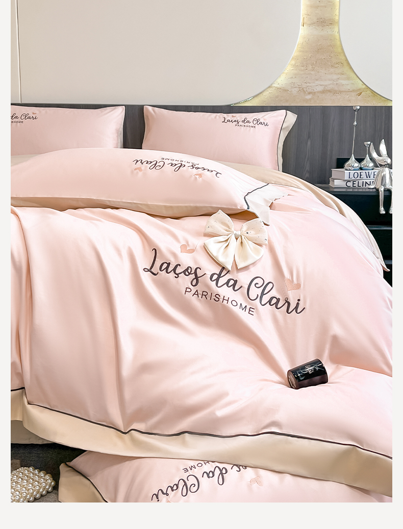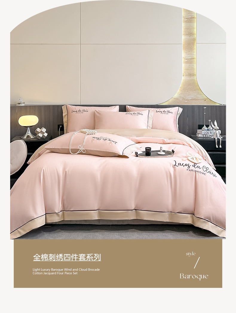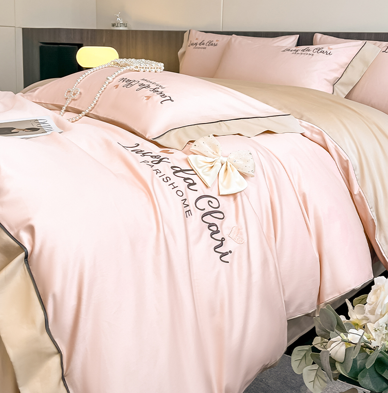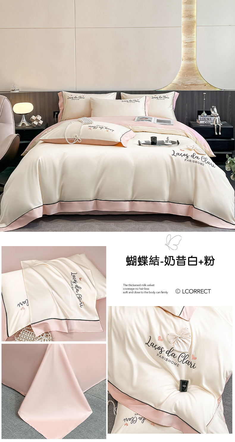 当前位置: 91家纺网 > 商品网购 > 床品套件 > 四件套 > 全棉普通四件套 > 娜娜 2024新款全棉时尚刺绣AB版双拼宽边绣花四件套--蝴蝶结系列 蝴蝶结-粉+奶咖