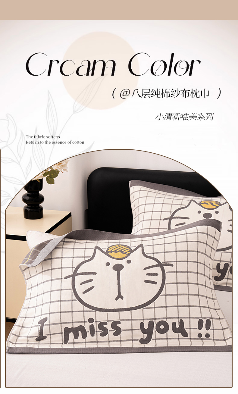 棠薇家纺 2025新款加厚枕巾全棉纱布枕巾纯棉一对装枕头巾八层纱布枕巾 52*78±2cm 好奇猫