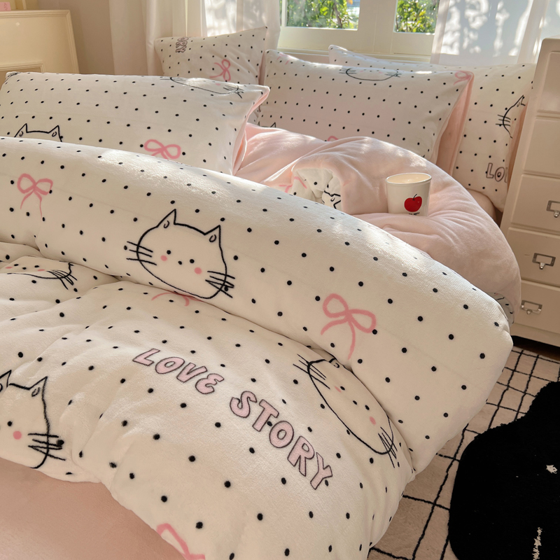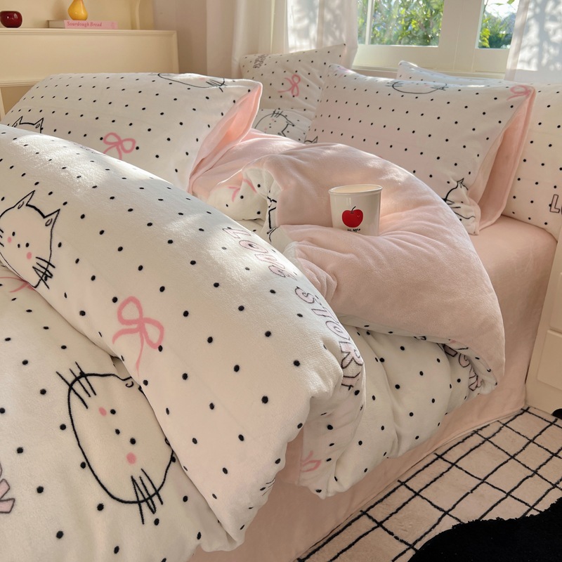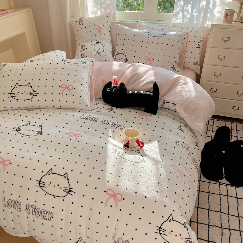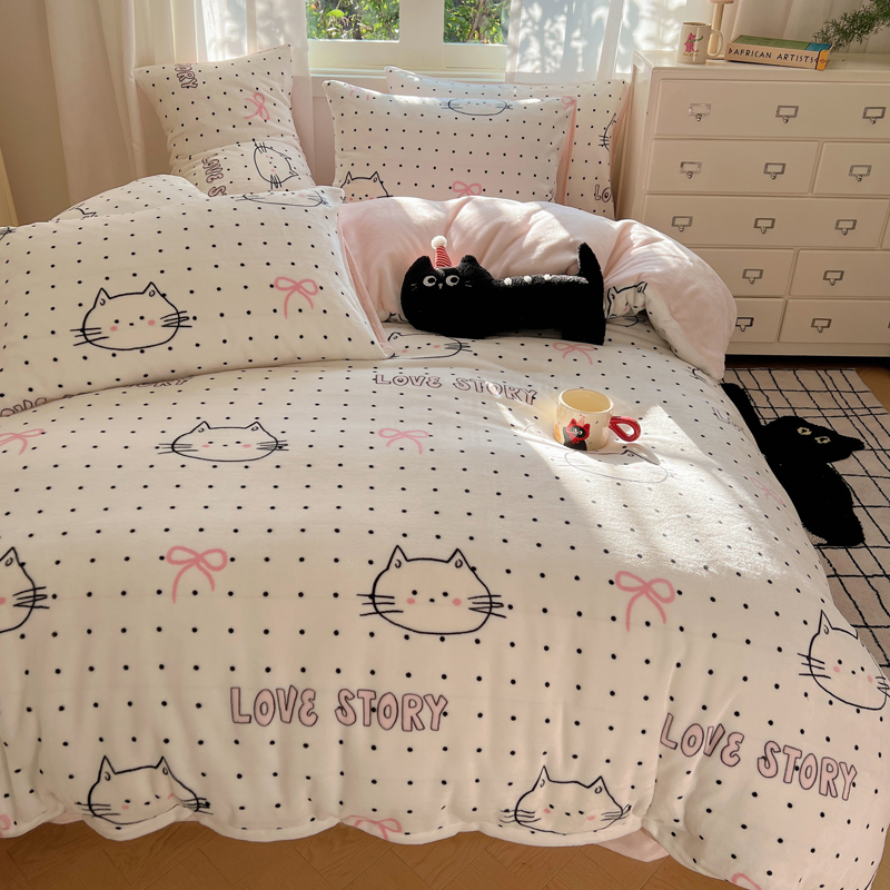顾里家纺 2024新款加厚牛奶绒ins奶油治愈系少女心保暖四件套系列-风格二 波点猫咪