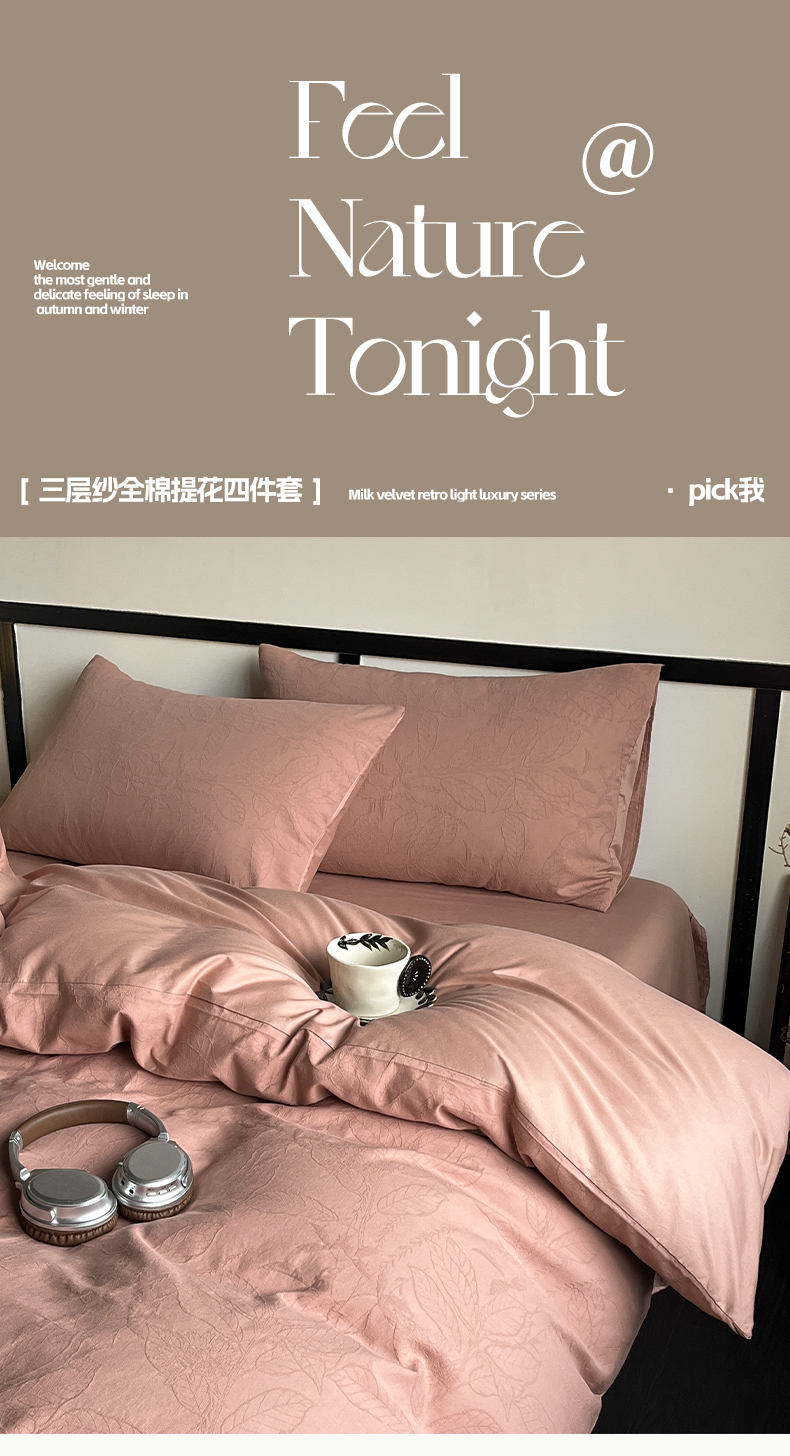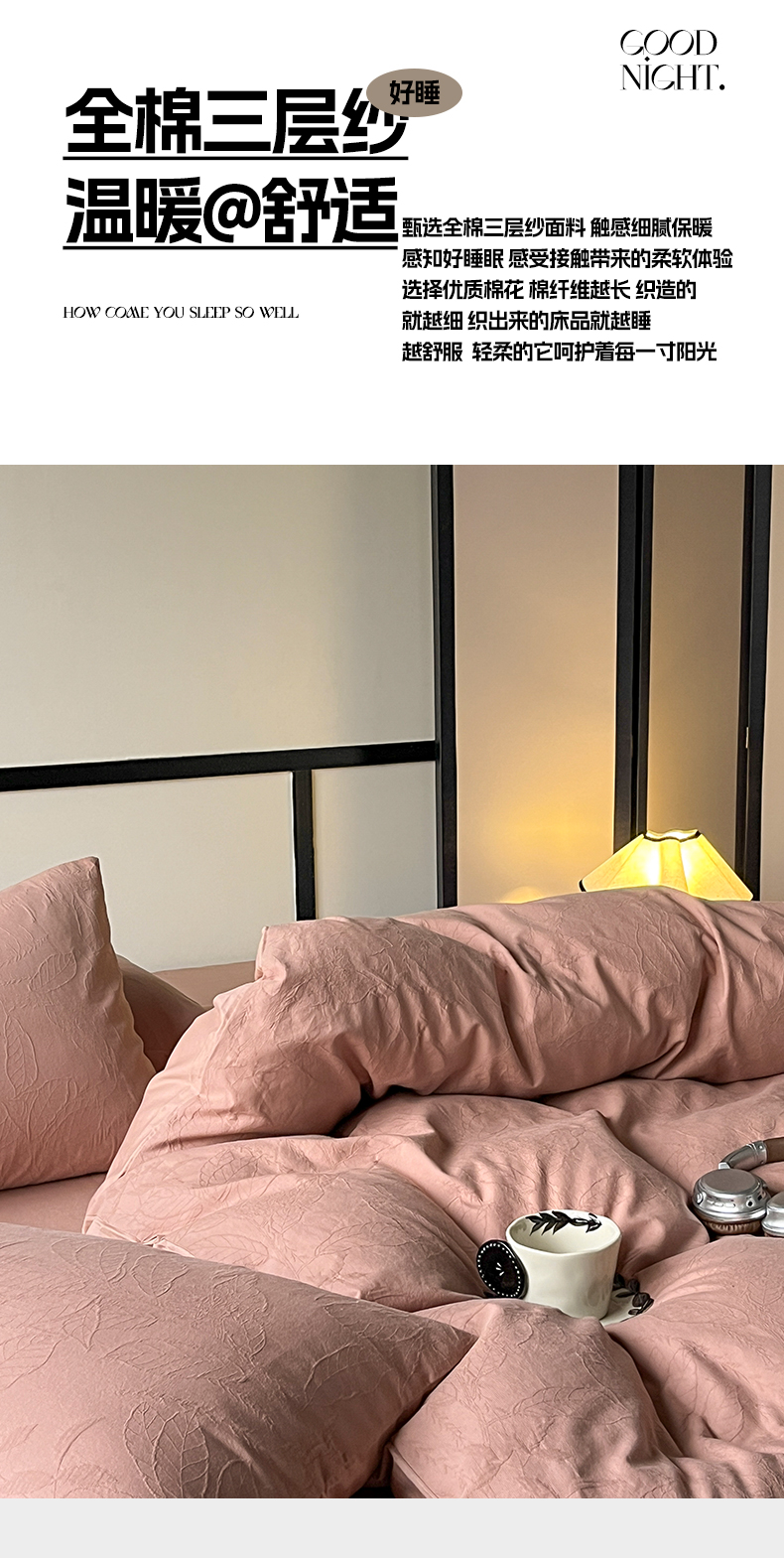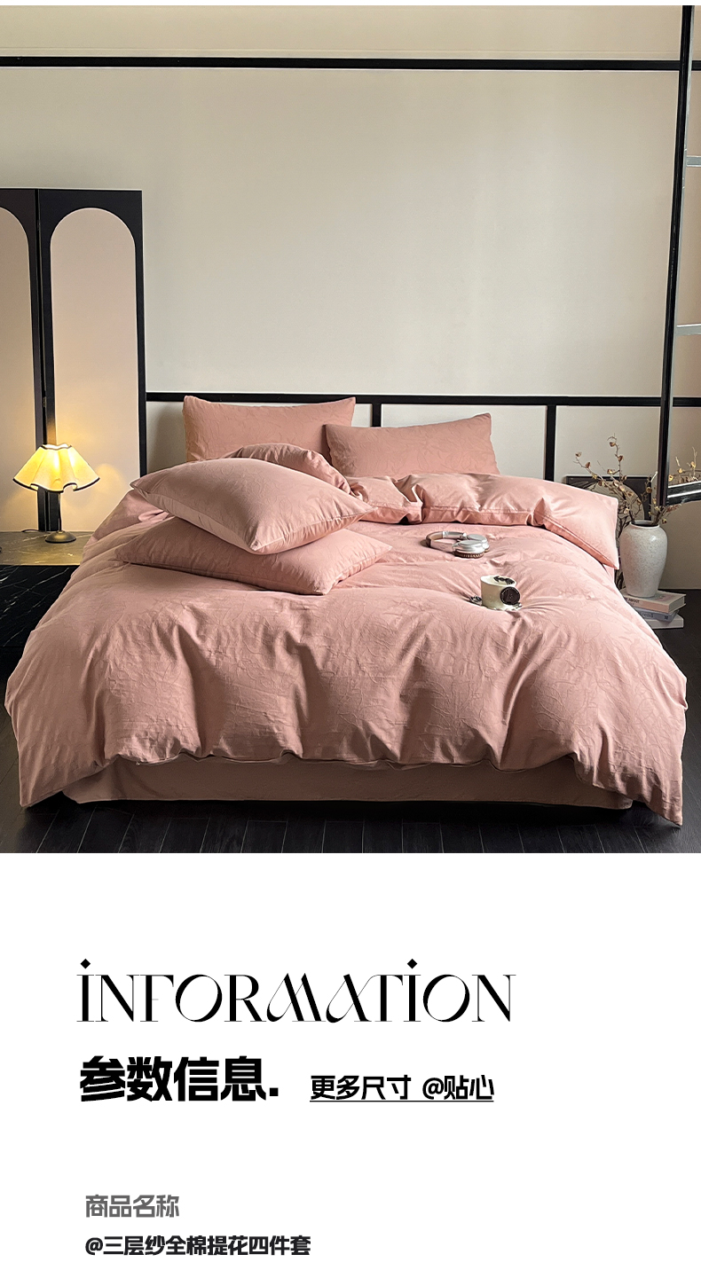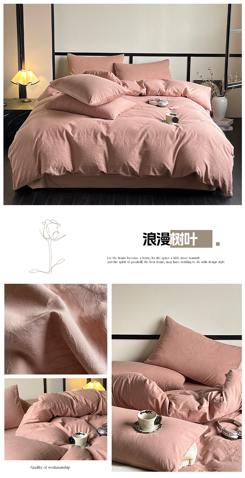 商品名称:雅居纺家纺 2024新款100%全棉三层纱提花四件套 浪漫树叶