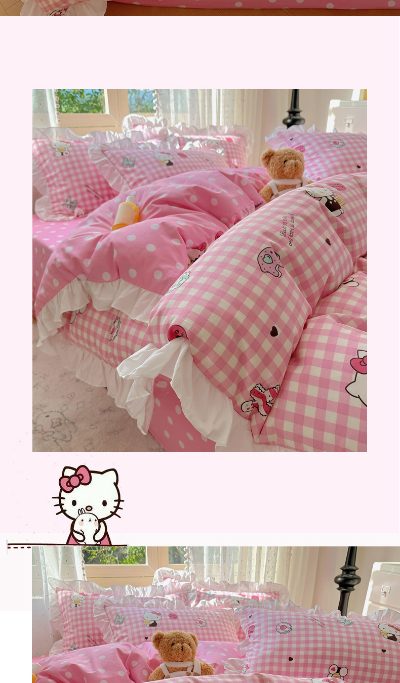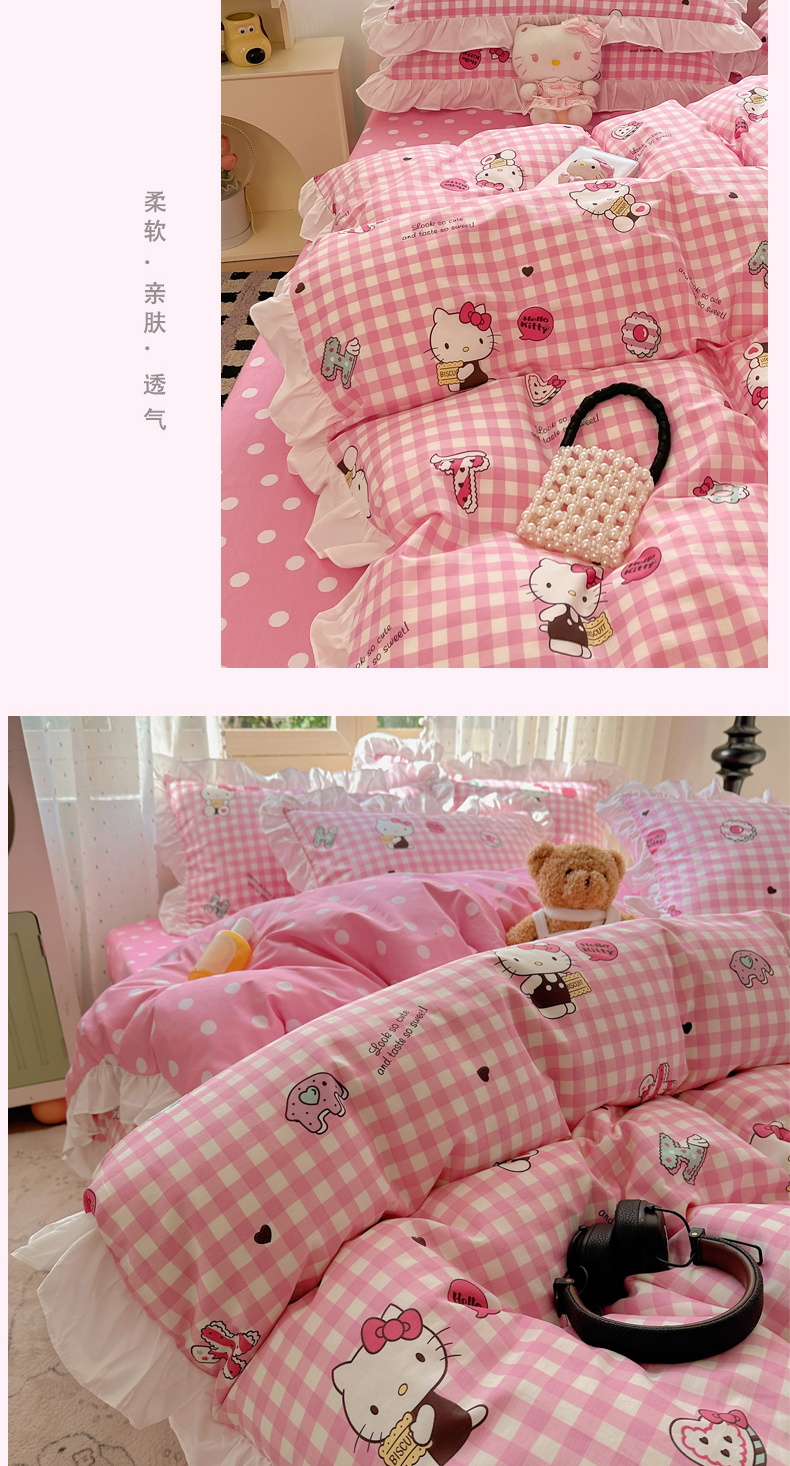 商品名称:三朵家纺 2025新款全棉花边款三丽欧系列四件套 粉格凯蒂