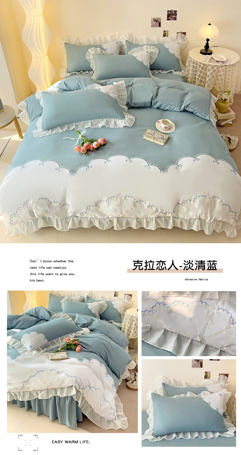 当前位置: 91家纺网 > 商品网购 > 床品套件 > 四件套 > 水洗棉四件套 > 慕语家纺 2025新款韩版高支高密水洗磨毛棉贴布绣四件套-克拉恋人 克拉恋人-淡清蓝