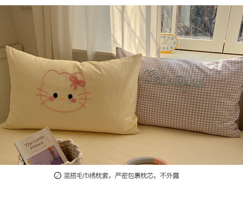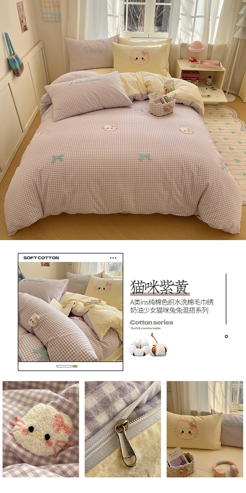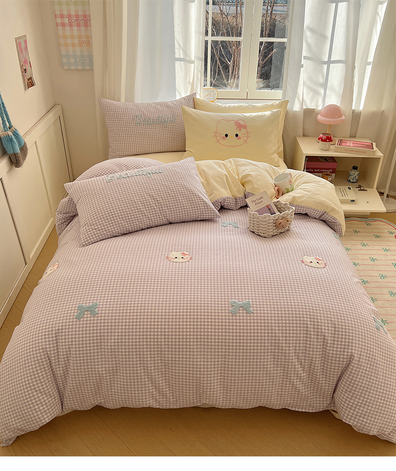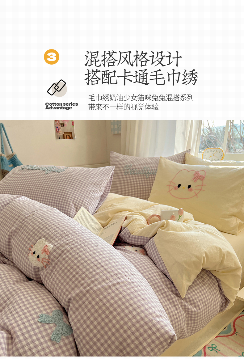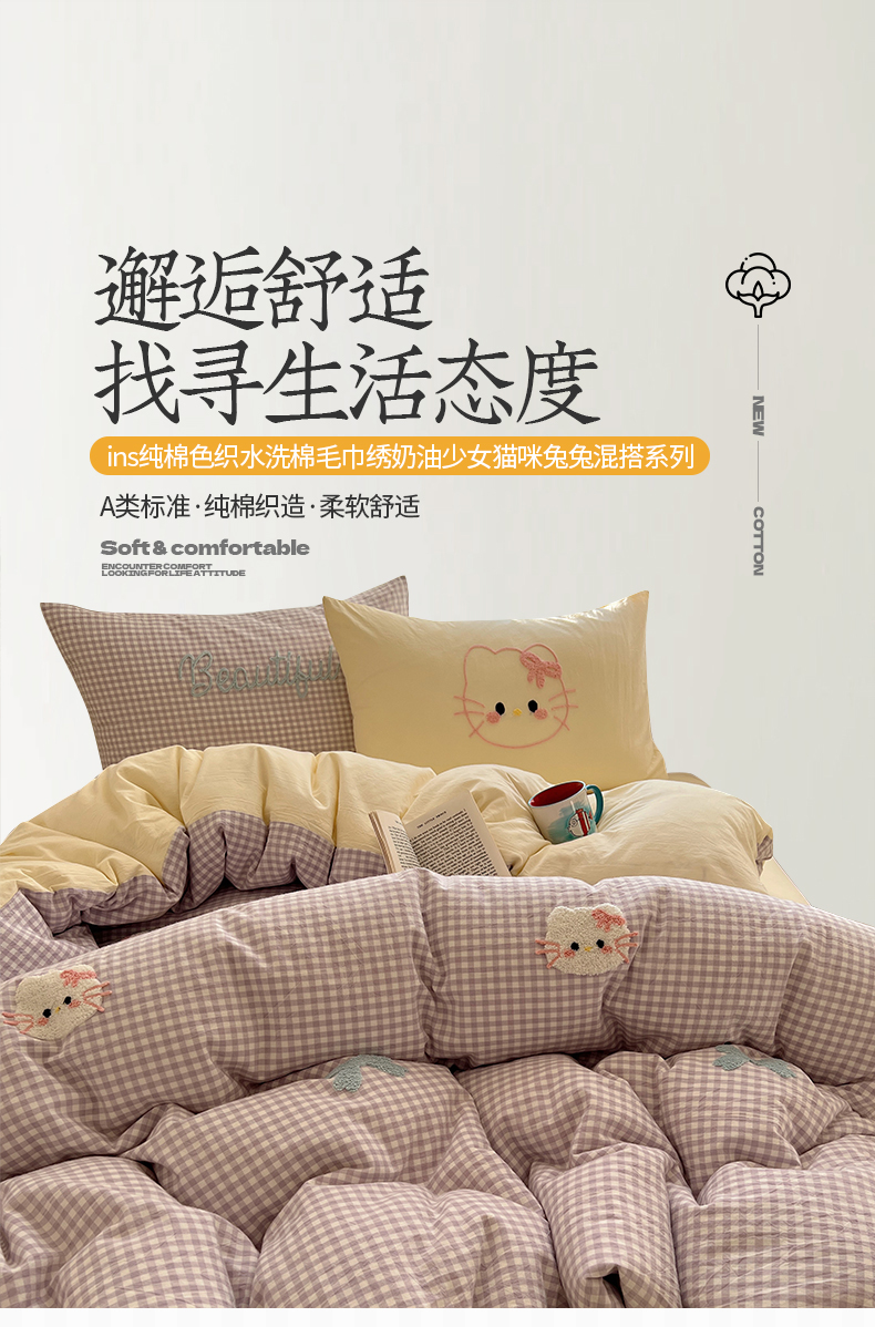 当前位置: 91家纺网 > 商品网购 > 床品套件 > 四件套 > 水洗棉四件套 > 桃子家居 2025新款A类ins纯棉色织水洗棉毛巾绣奶油少女猫咪兔兔混搭系列四件套 色织水洗棉-猫咪紫黄