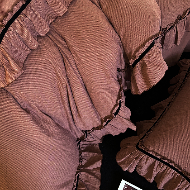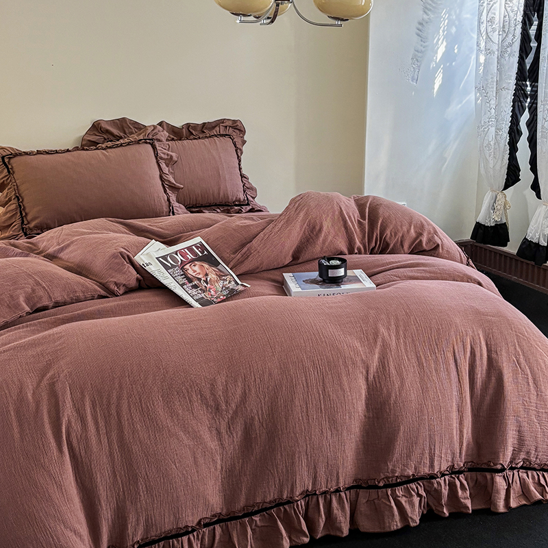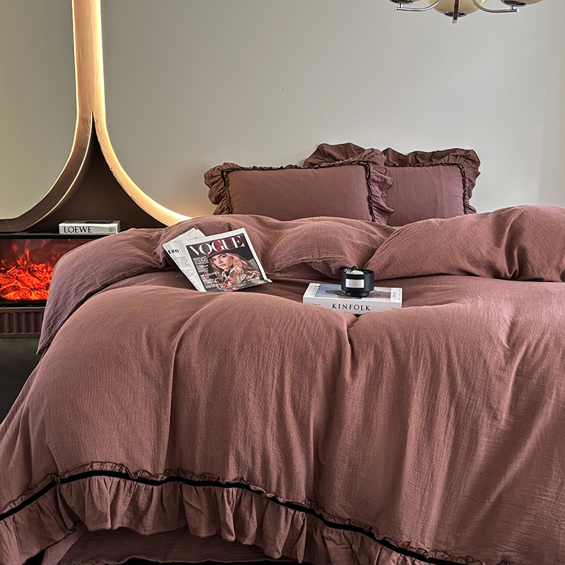 (总)多乐娜 2025年新款轻法式复古风纯棉色织双层纱四件套花边全棉工艺款,沐光栗棕,沐光绿蔓