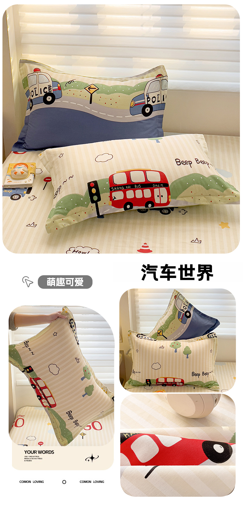 春雨家居 2025新款春夏卡通印花全棉单枕套 2.汽车世界
