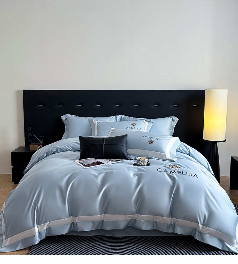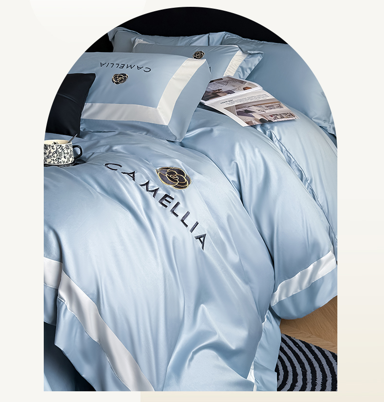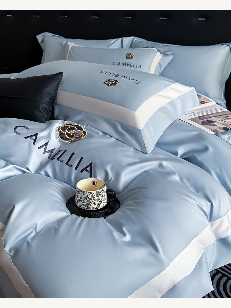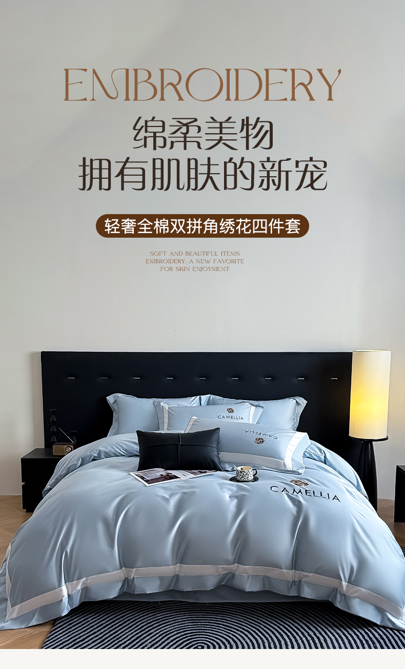 商品名称:水云缦 2025新款轻奢全棉双拼角绣花四件套-米兰系列 米兰-繁星蓝