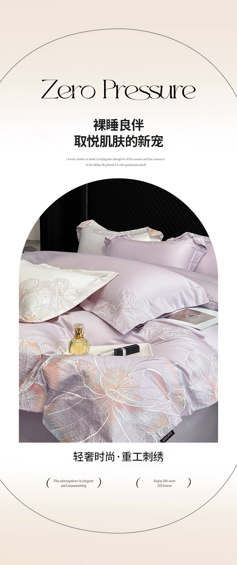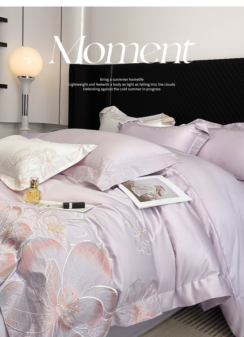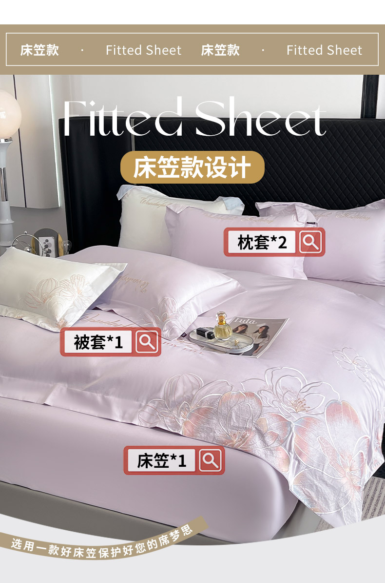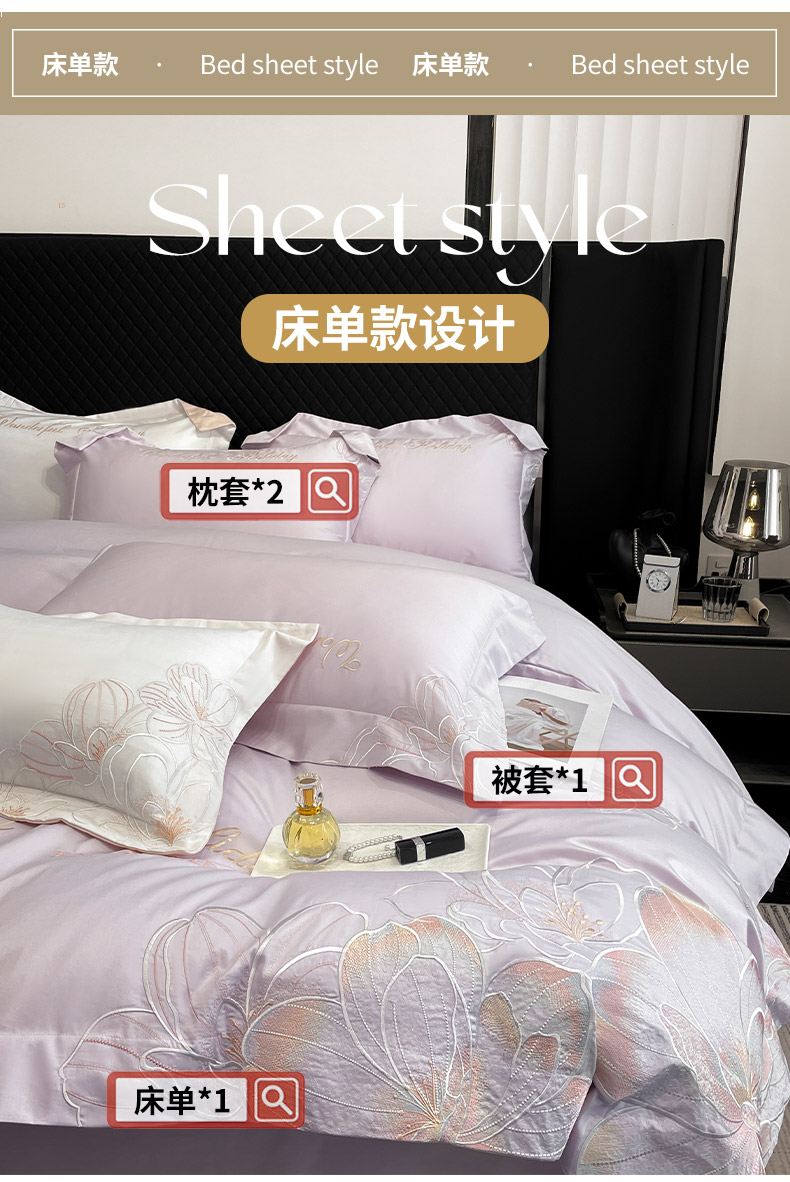 商品名称:2025新款轻奢风A类100支长绒棉四件套全棉纯棉重工刺绣床单床笠夹棉床笠床盖款高端床上用品-星慕 黛紫