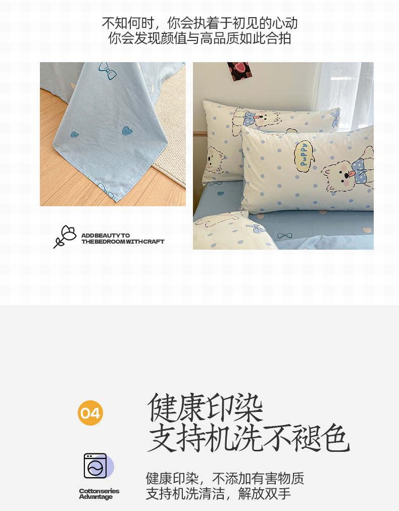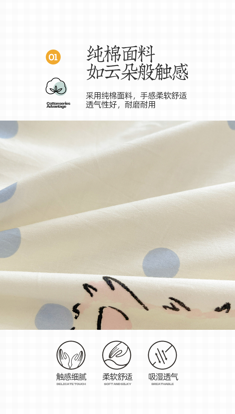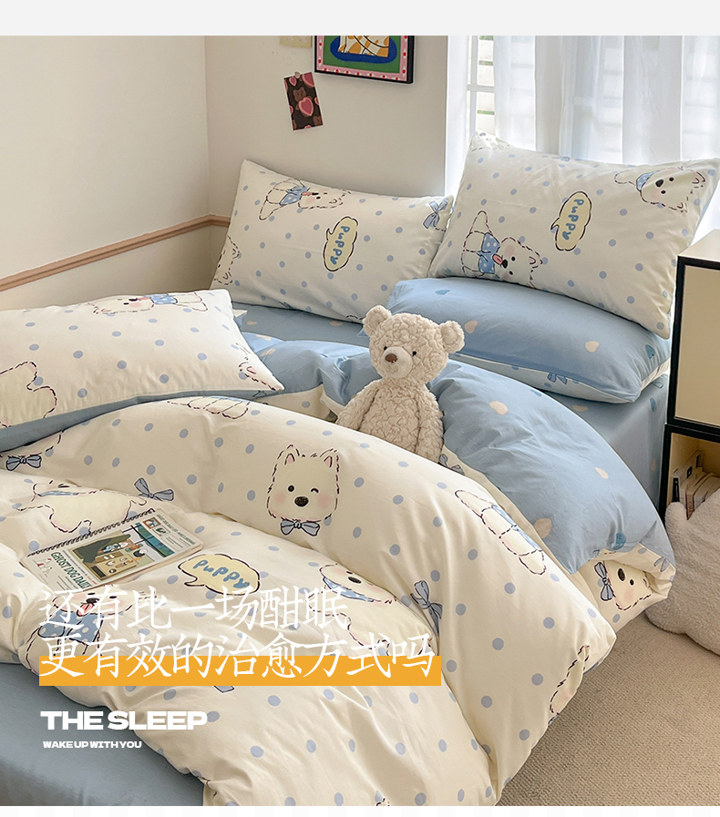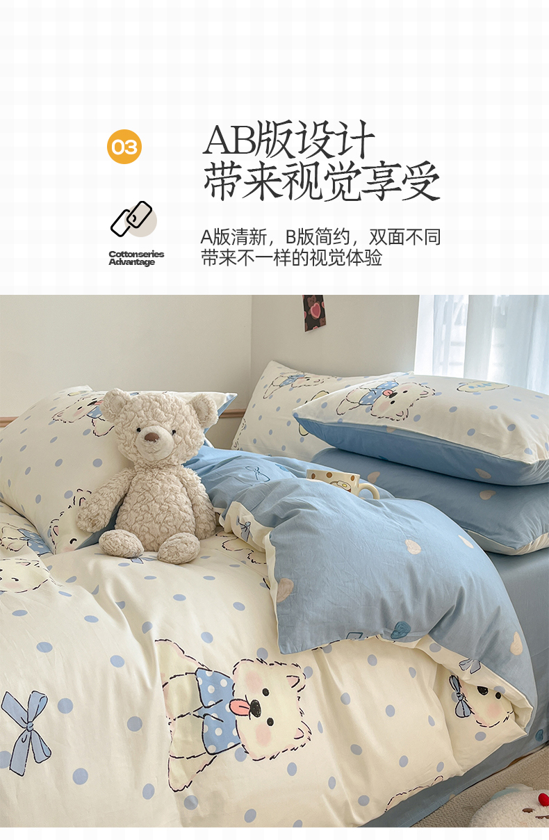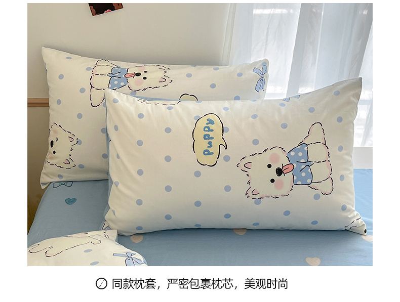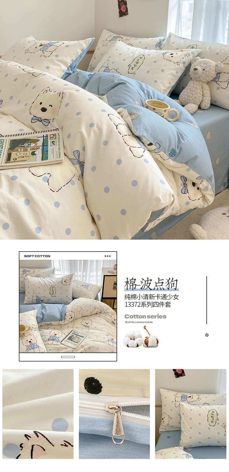 当前位置: 91家纺网 > 商品网购 > 床品套件 > 四件套 > 全棉普通四件套 > 桃子家居 2025新款纯棉小清新13372卡通可爱少女系列四件套 棉-波点狗