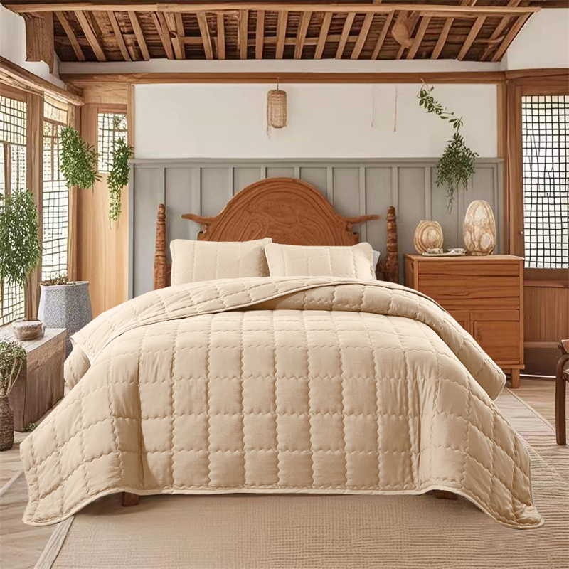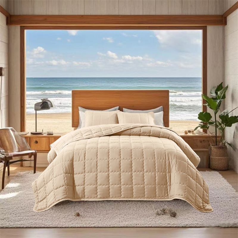 温宁2025新款跨境外贸专供化纤水洗棉麦穗夹棉四季床盖 米色