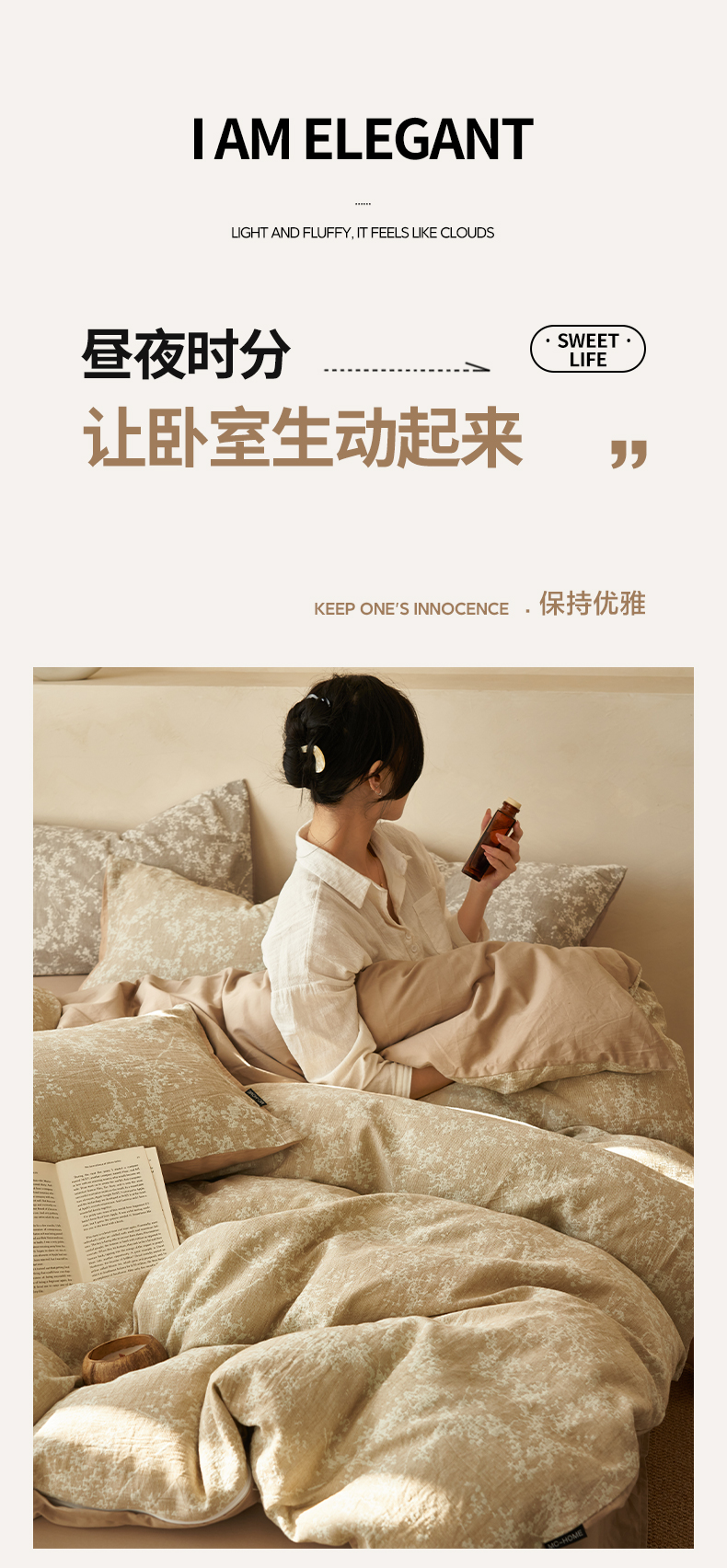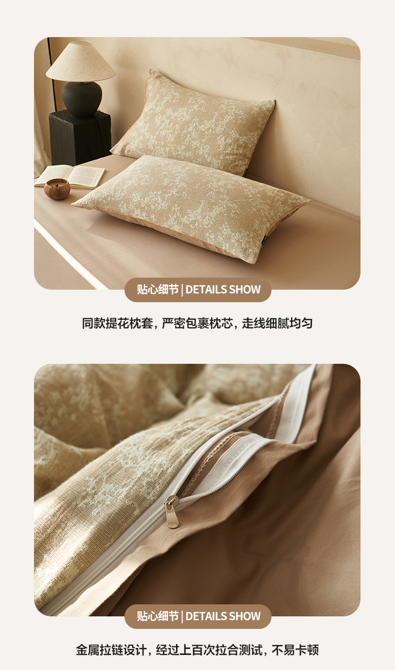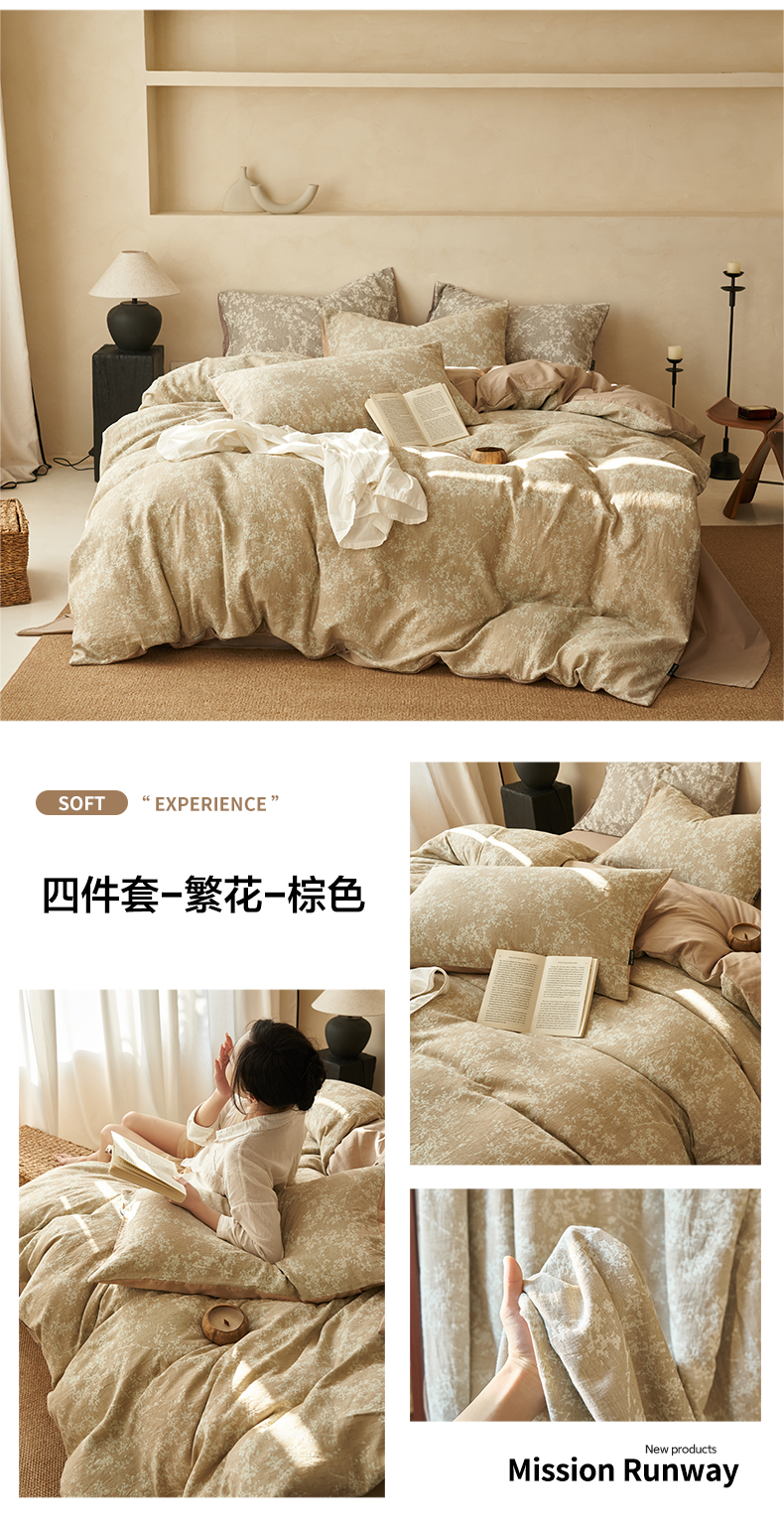 商品名称:2025新款纯棉水洗棉三层纱繁花提花四件套 四件套-繁花-棕色