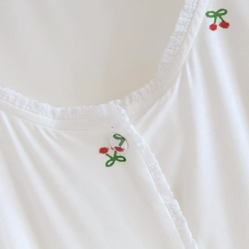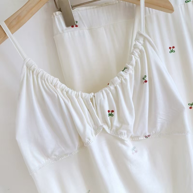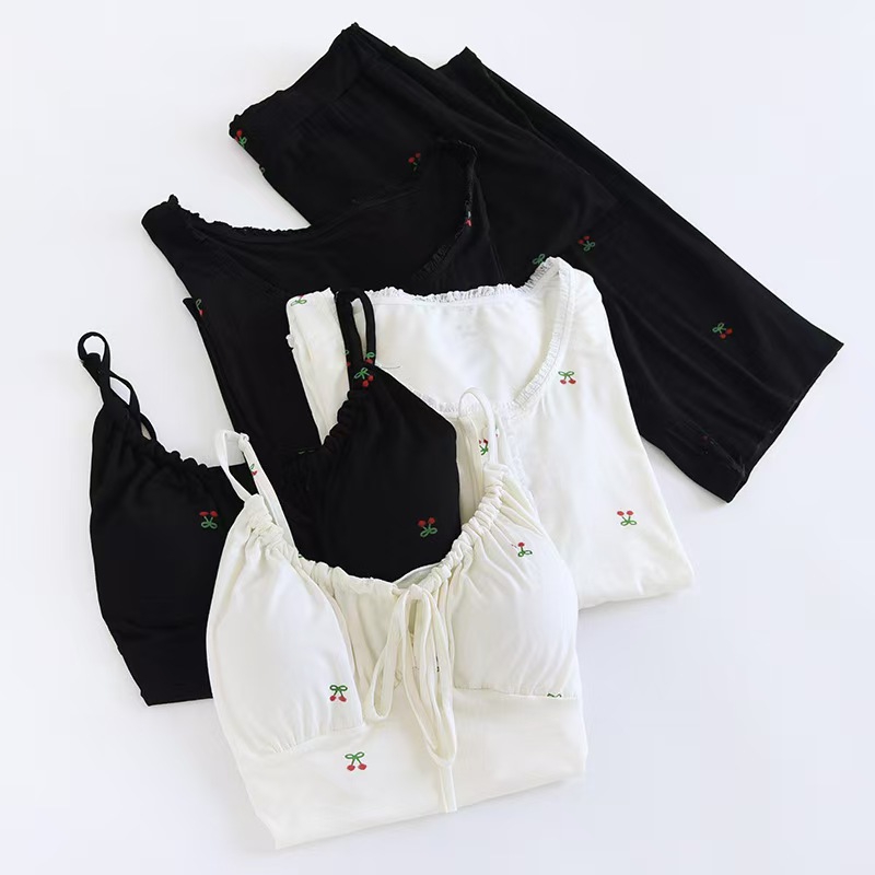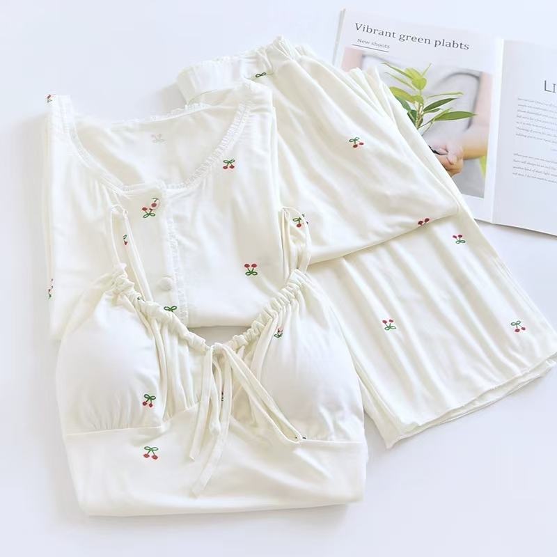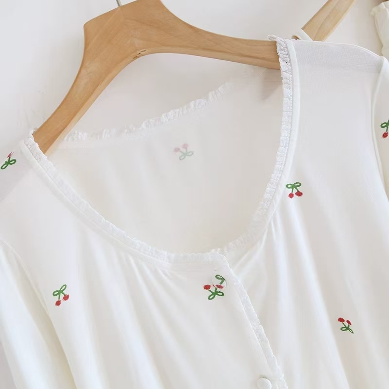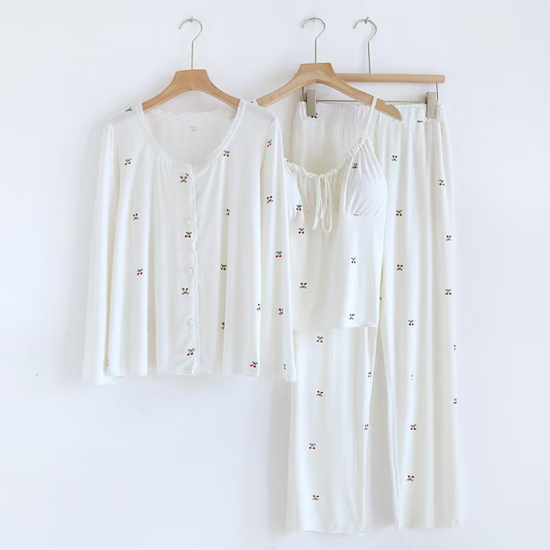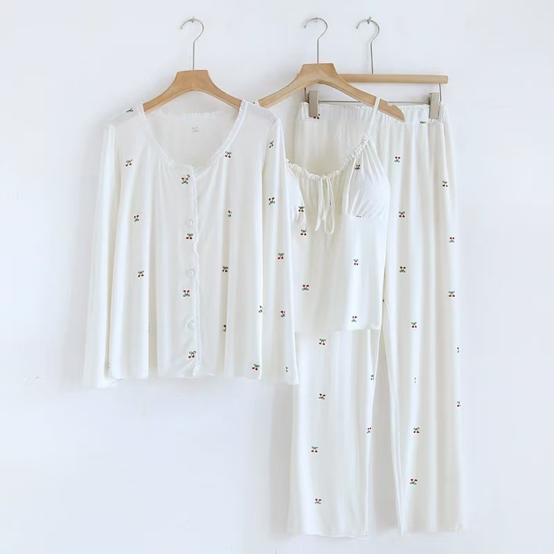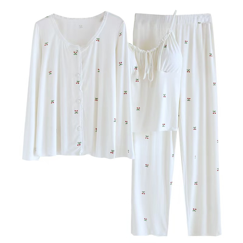 洛兰沙家居馆【只代发】【只代发】2025新款外贸欧美风淑女风莫代尔睡衣女春夏秋开衫短袖吊带三件套长裤家居服 三件套白色