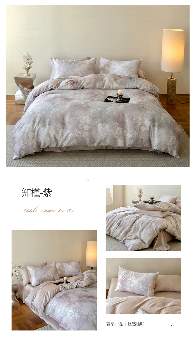 当前位置: 91家纺网 > 商品网购 > 床品套件 > 四件套 > 莱赛尔四件套 > 沐晴家纺 2025春夏新款纯色数码印花60兰精天丝四件套 知槿-紫