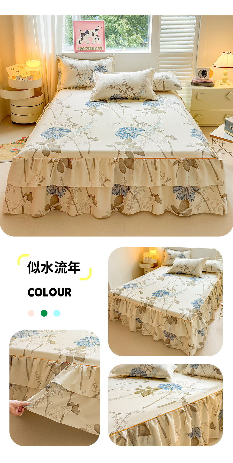 • 91家纺网 家纺一手货源 找家纺 爱一个家 2023新款芦荟棉双边单床裙 似水流年