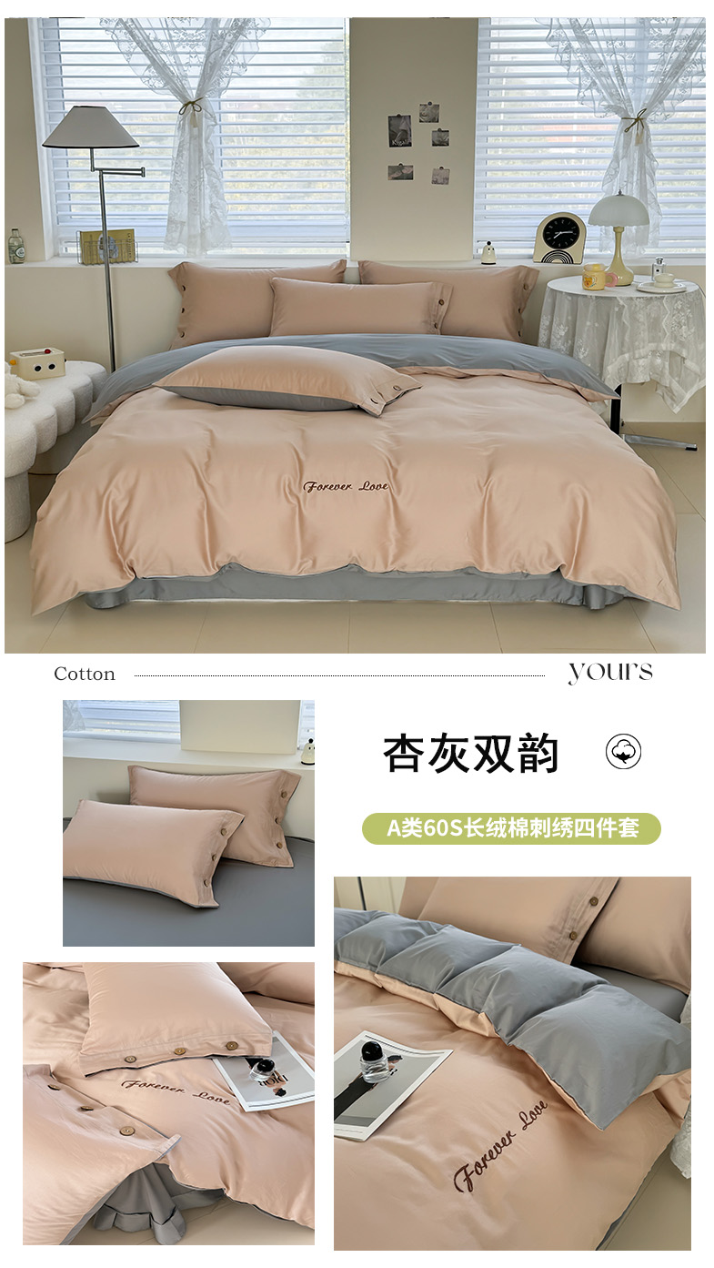 当前位置: 91家纺网 > 商品网购 > 床品套件 > 四件套 > 长绒棉四件套 > 2025新款A类纯色双拼长绒棉纯棉刺绣四件套 杏灰双韵