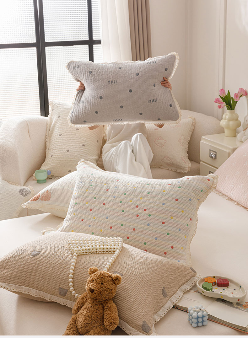 (总)麻依 2025新款棉花糖枕巾全棉四层纱布双层花边,抱抱熊,点点-灰,点点-米白,花影-粉,花影-米白,墨心,奶油草莓,帕帕熊,牵手小熊,生日腊肠狗,甜甜圈小熊,小蝴蝶结,小南瓜,小柿子,樱桃香