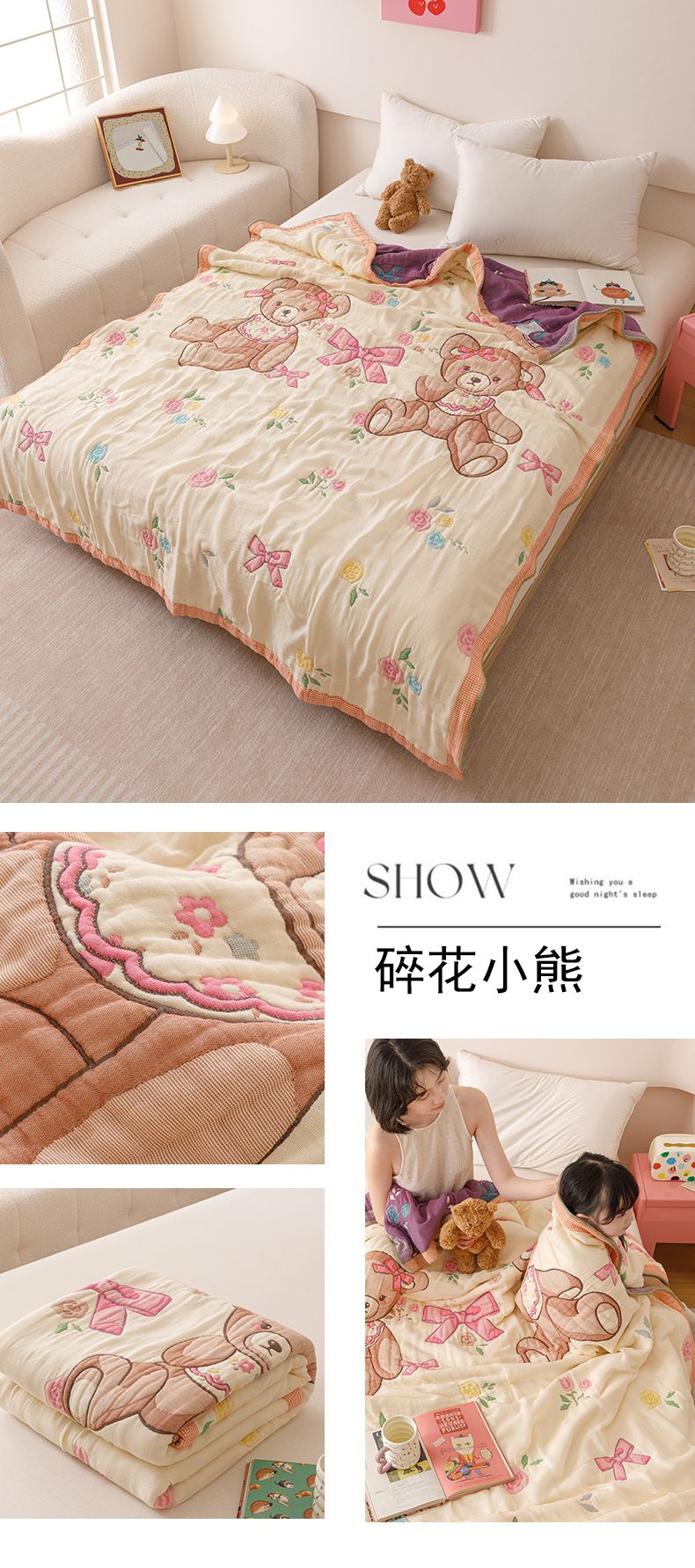 (总)麻依 2025新款十层纱布棉花糖春秋被被子泡芙被,抱抱熊,点点-白,点点-灰,花影-粉,花影-米,墨心,奶油草莓,帕帕熊,牵手小熊,生日腊肠狗,甜甜圈小熊,小蝴蝶结,小南瓜,小柿子,樱桃香
