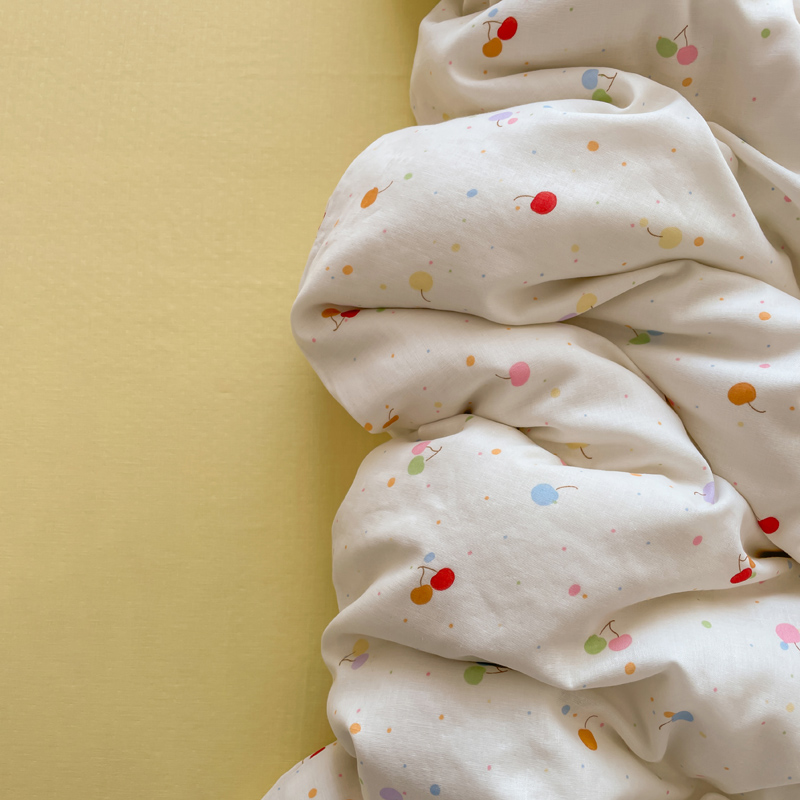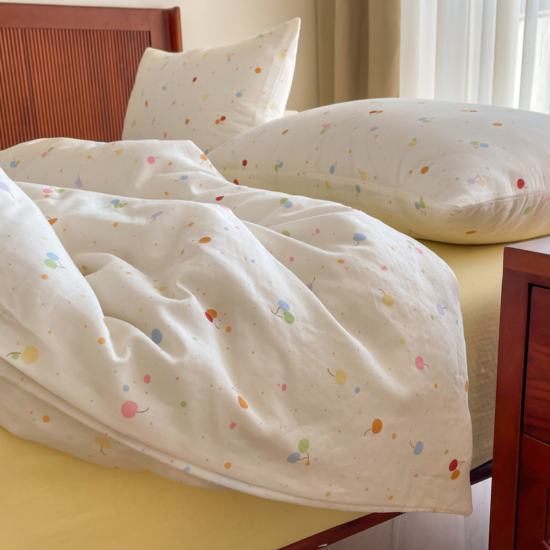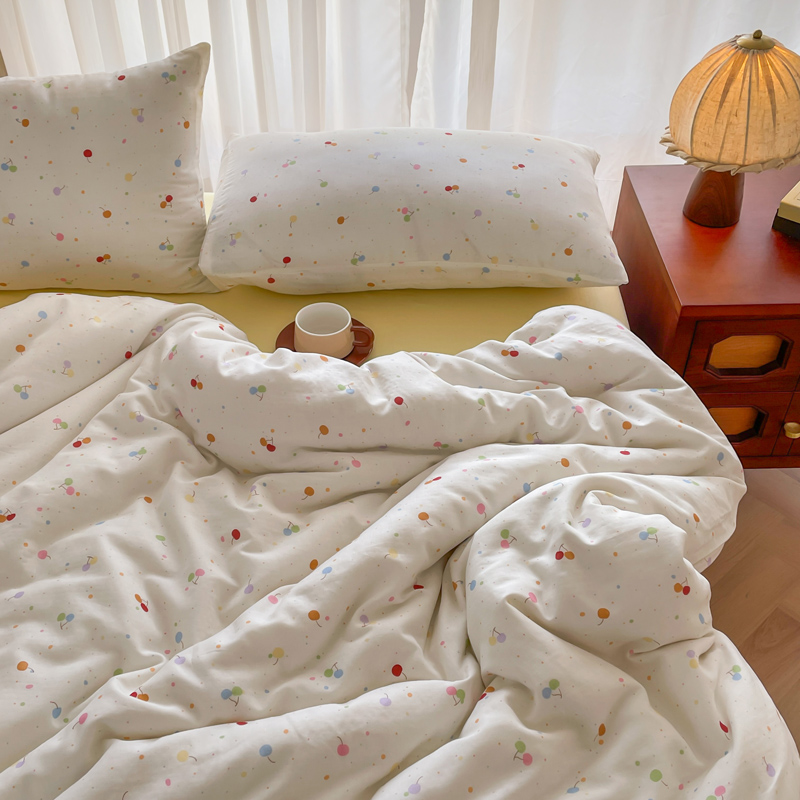 商品名称:一比一家纺 2025新款全棉母婴级抗菌有氧全棉双层纱亲肤全棉小清新印花三件套四件套 七彩樱桃