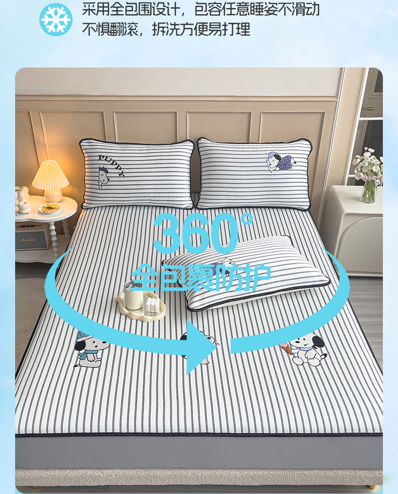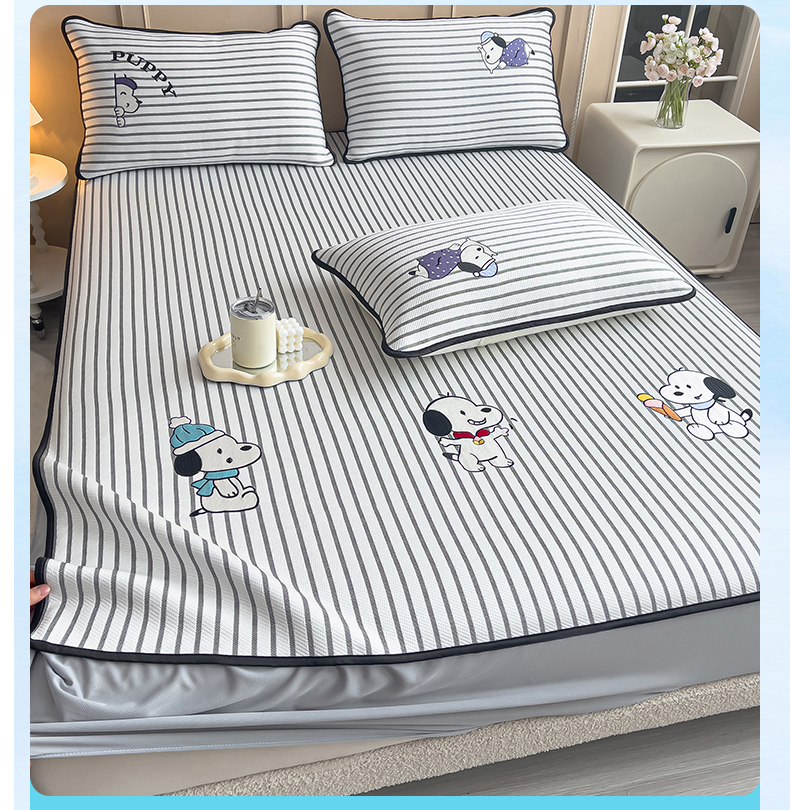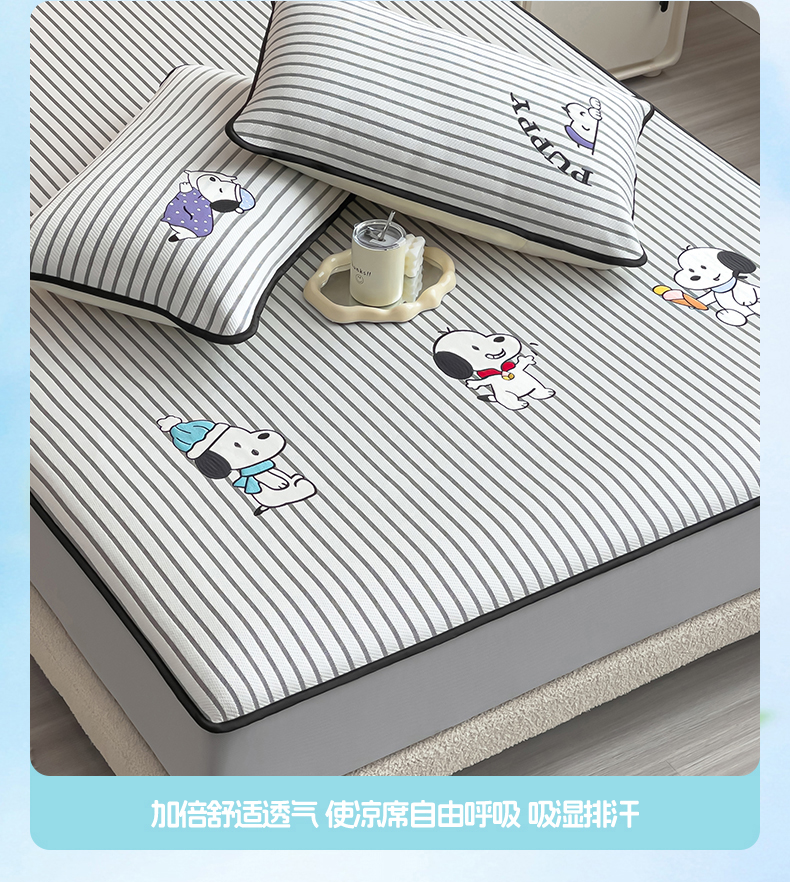 炫拼 2025新款A类凉豆豆提花条纹卡通刺绣床笠席三件套 冰淇淋狗