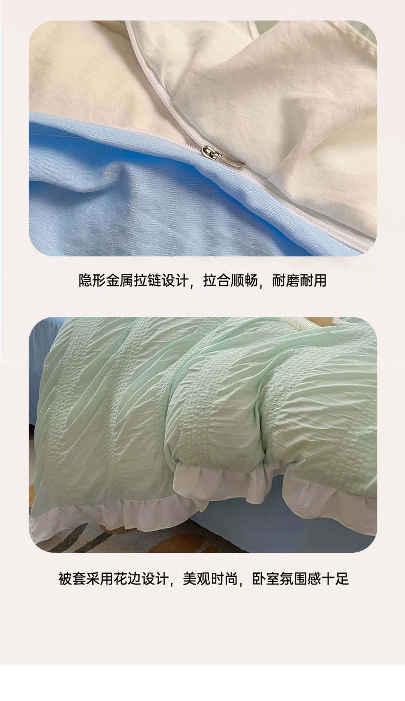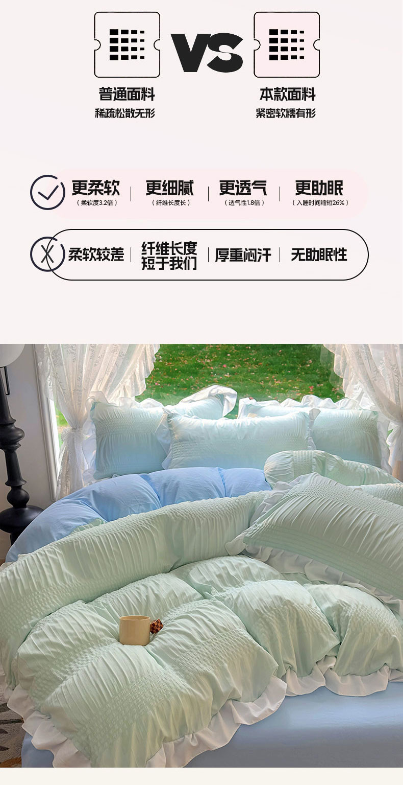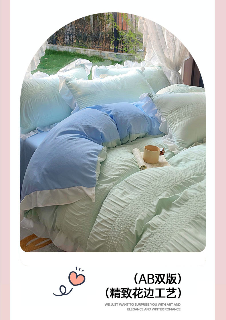 当前位置: 91家纺网 > 商品网购 > 床品套件 > 四件套 > 其它四件套 > 灰鲸2025新款泡泡纱公主风花边款四件套 泡泡纱花边款-薄荷绿+天空蓝