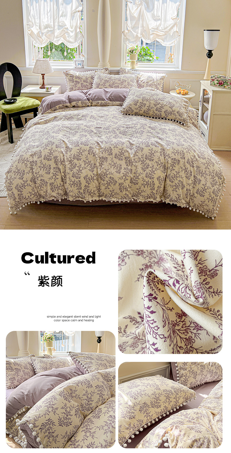 朵朵家纺 2025新款球球款云感四件套水洗棉简约风小碎花被套三件套(可定制尺寸 ) 紫颜