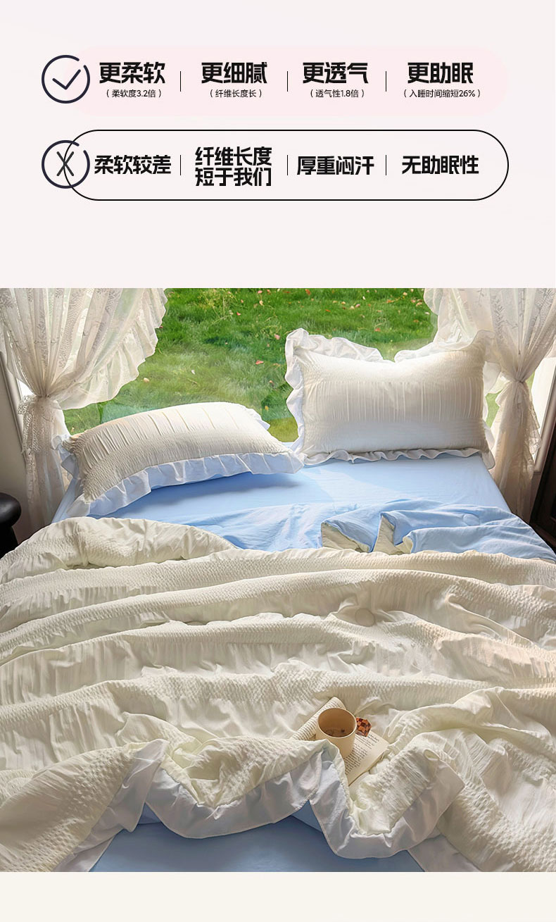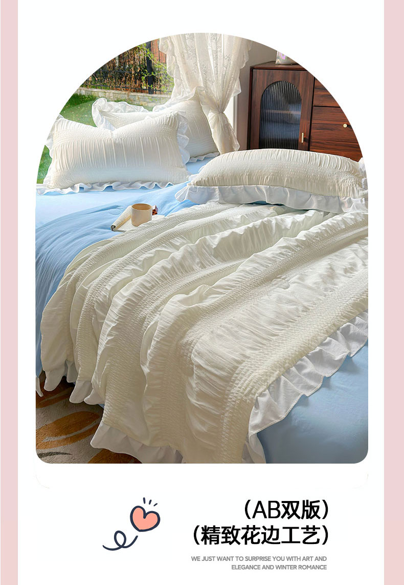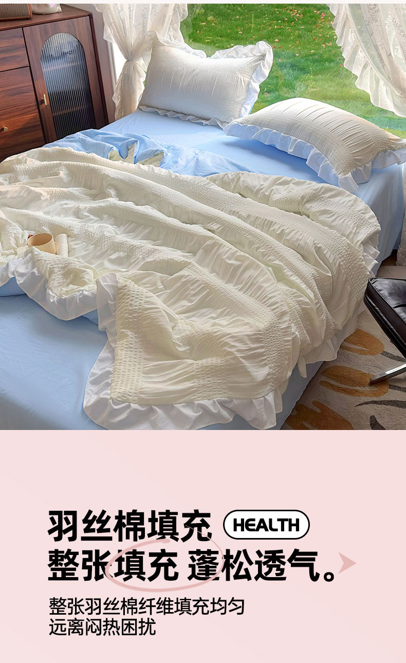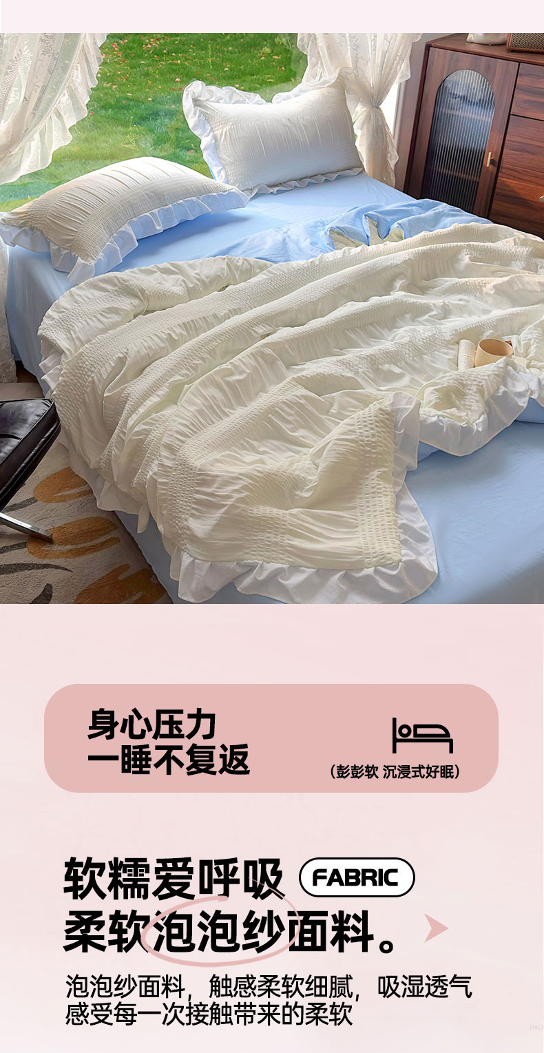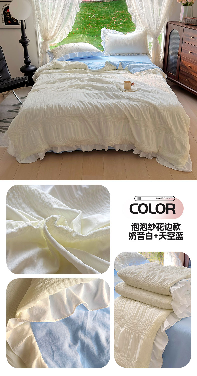 • 91家纺网 家纺一手货源 找家纺 灰鲸2025新款泡泡纱公主风花边款夏被夏凉被空调被四件套系列 泡泡纱花边款-奶昔白+天空蓝