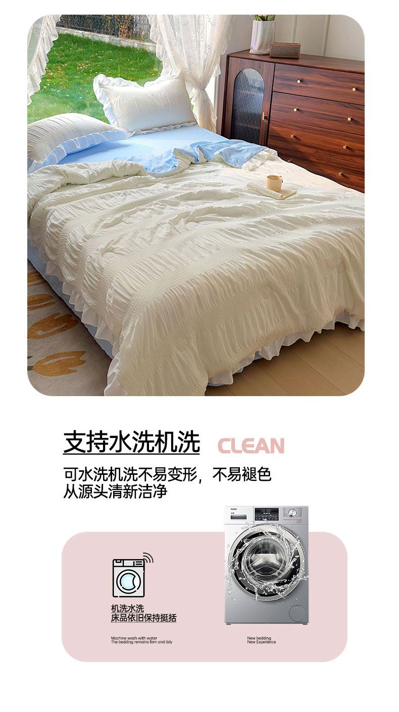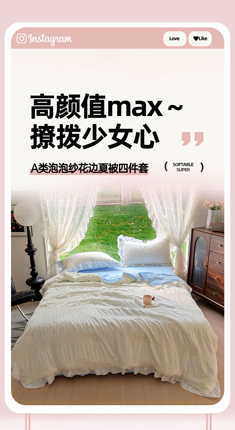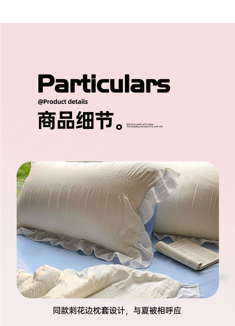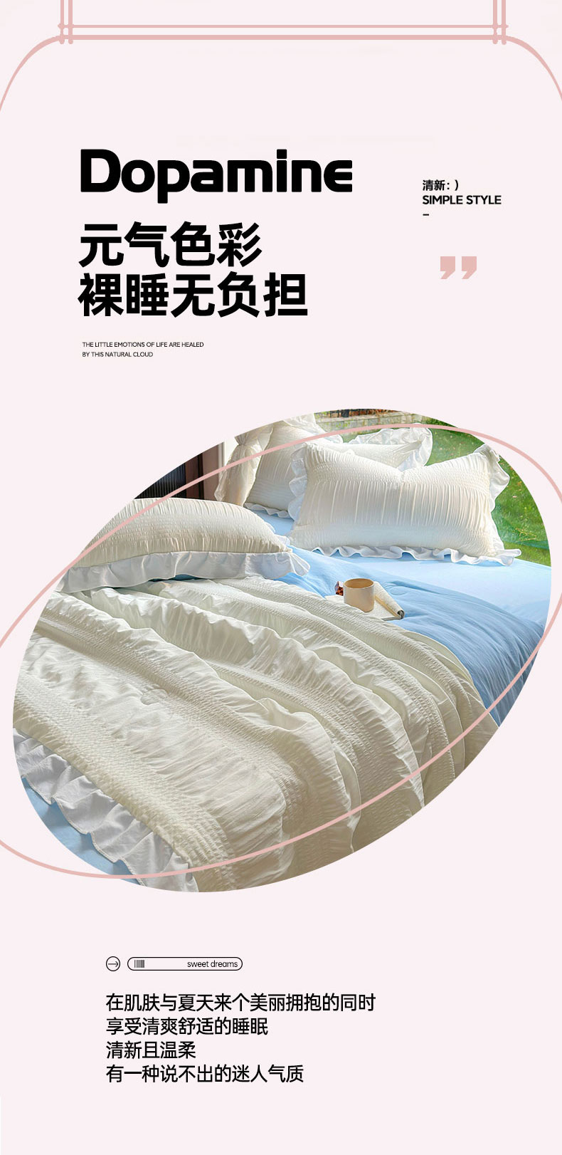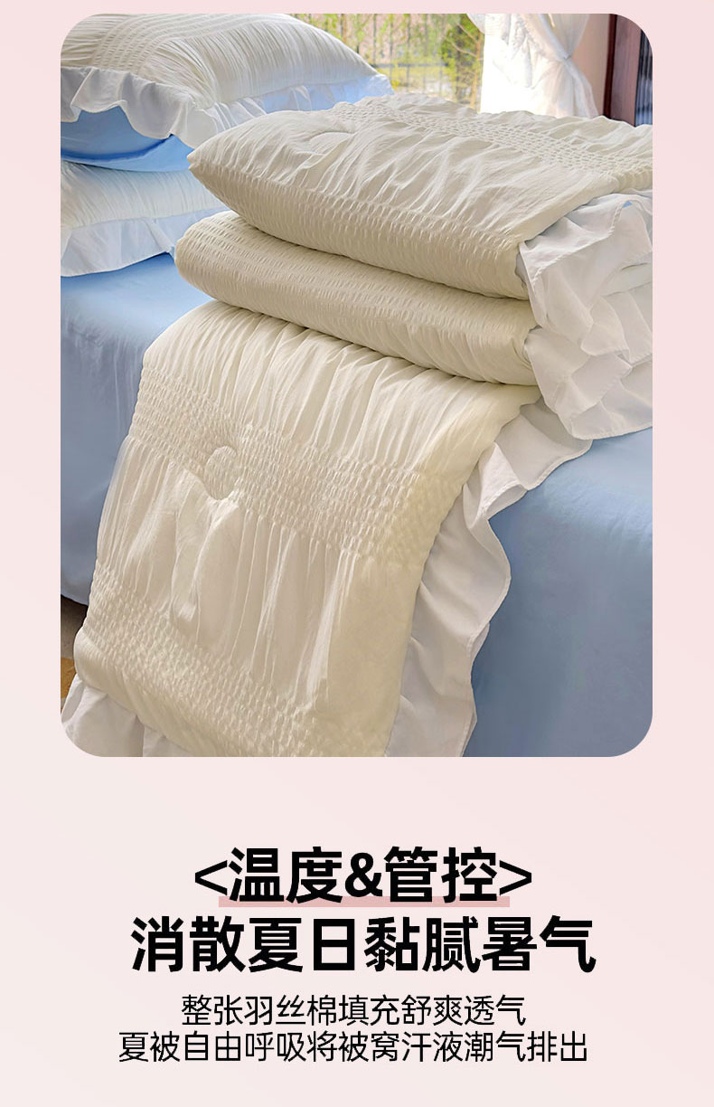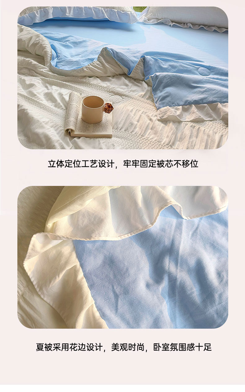 • 91家纺网 家纺一手货源 找家纺 灰鲸2025新款泡泡纱公主风花边款夏被夏凉被空调被四件套系列 泡泡纱花边款-奶昔白+天空蓝