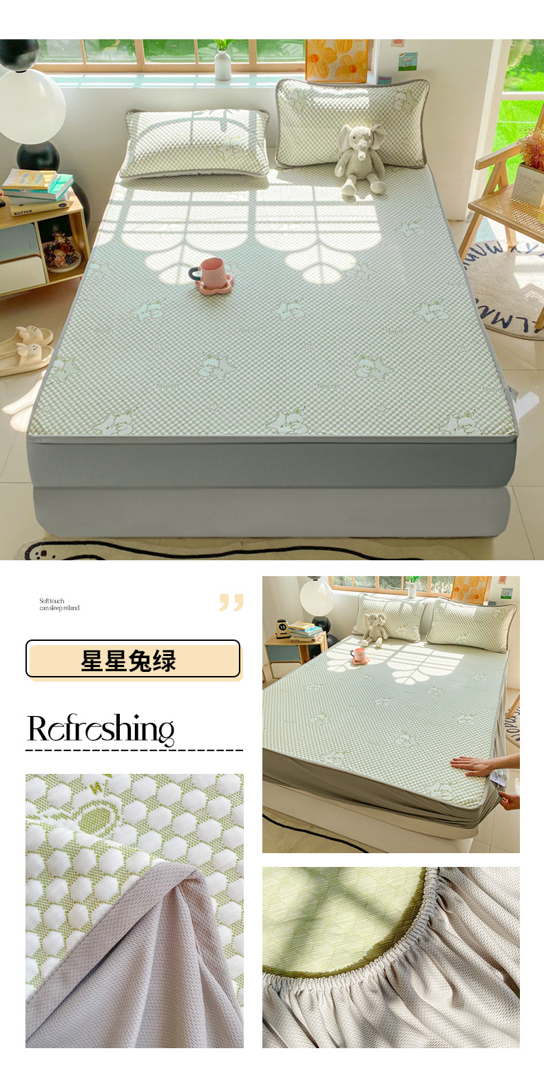 商品名称:千朵 2025新款凉感PE冰豆豆提花床笠款凉席 星星兔绿