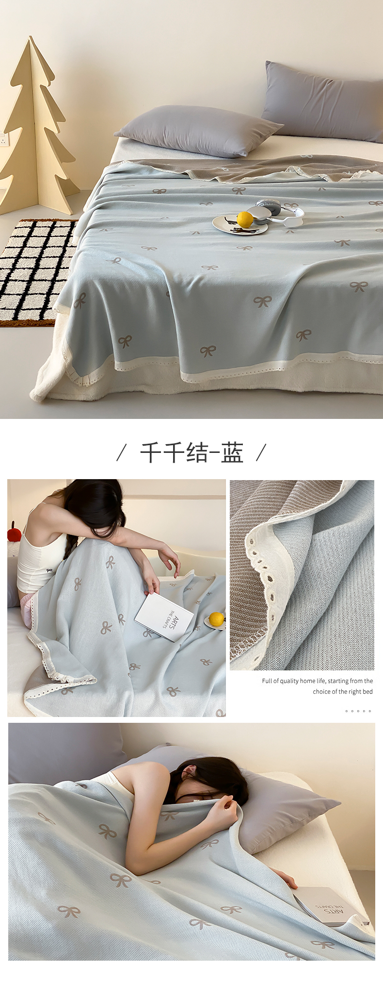 商品名称:麻依 2025新款花边天丝棉冷感毯 千千结-蓝