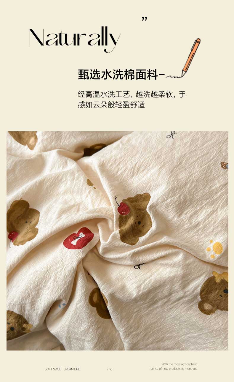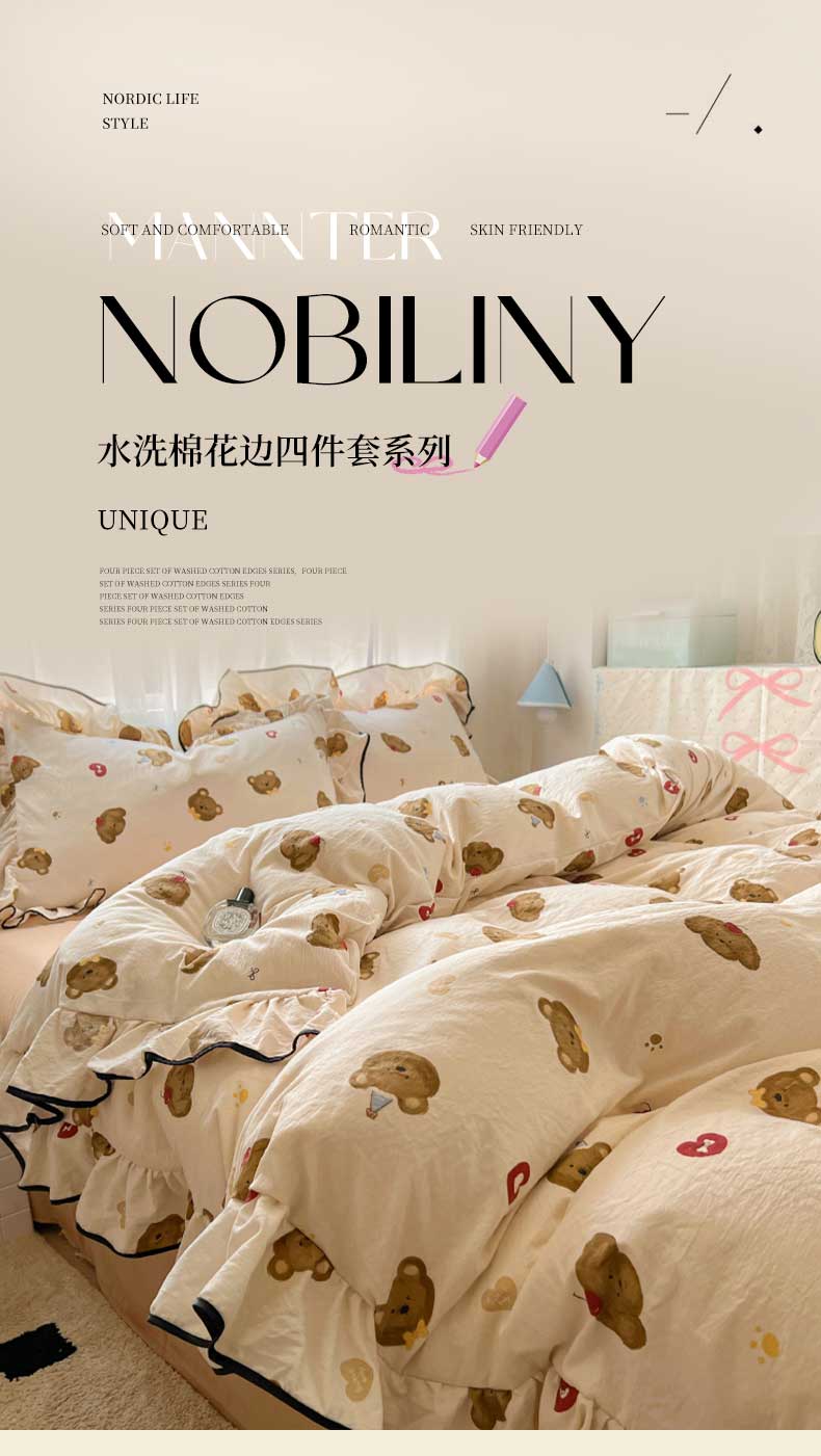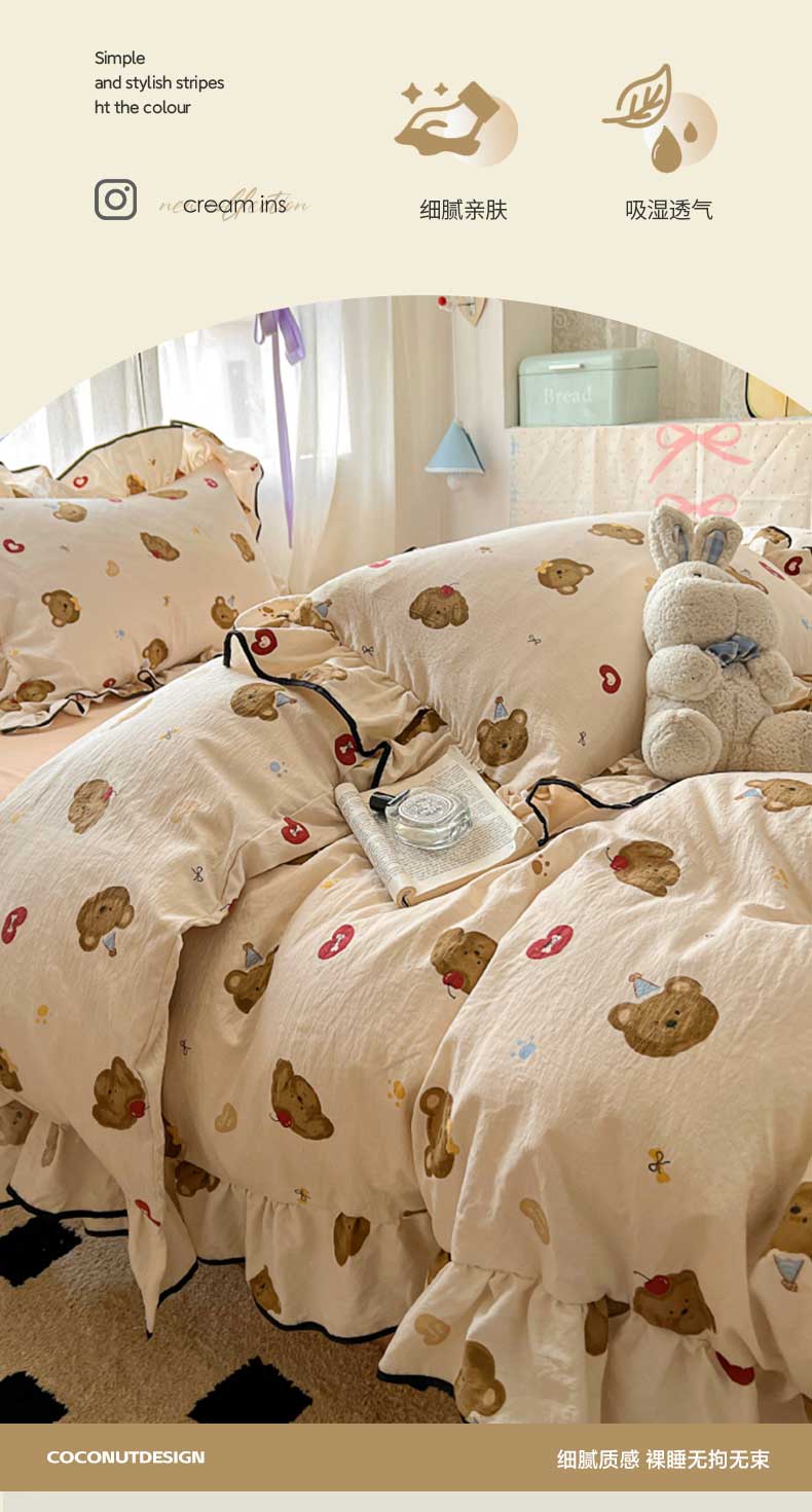 当前位置: 91家纺网 > 商品网购 > 床品套件 > 四件套 > 水洗棉四件套 > 繁花家居 2025春夏新款学生季韩式云感针织棉大花边木耳边四件套 小熊多多