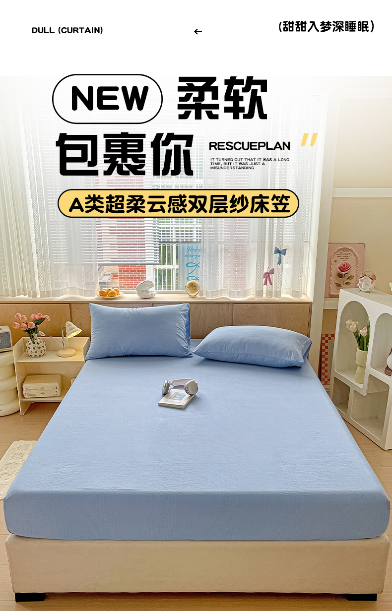卡迪熊家纺 2025新款超柔云感双层纱床笠 双层纱-天蓝